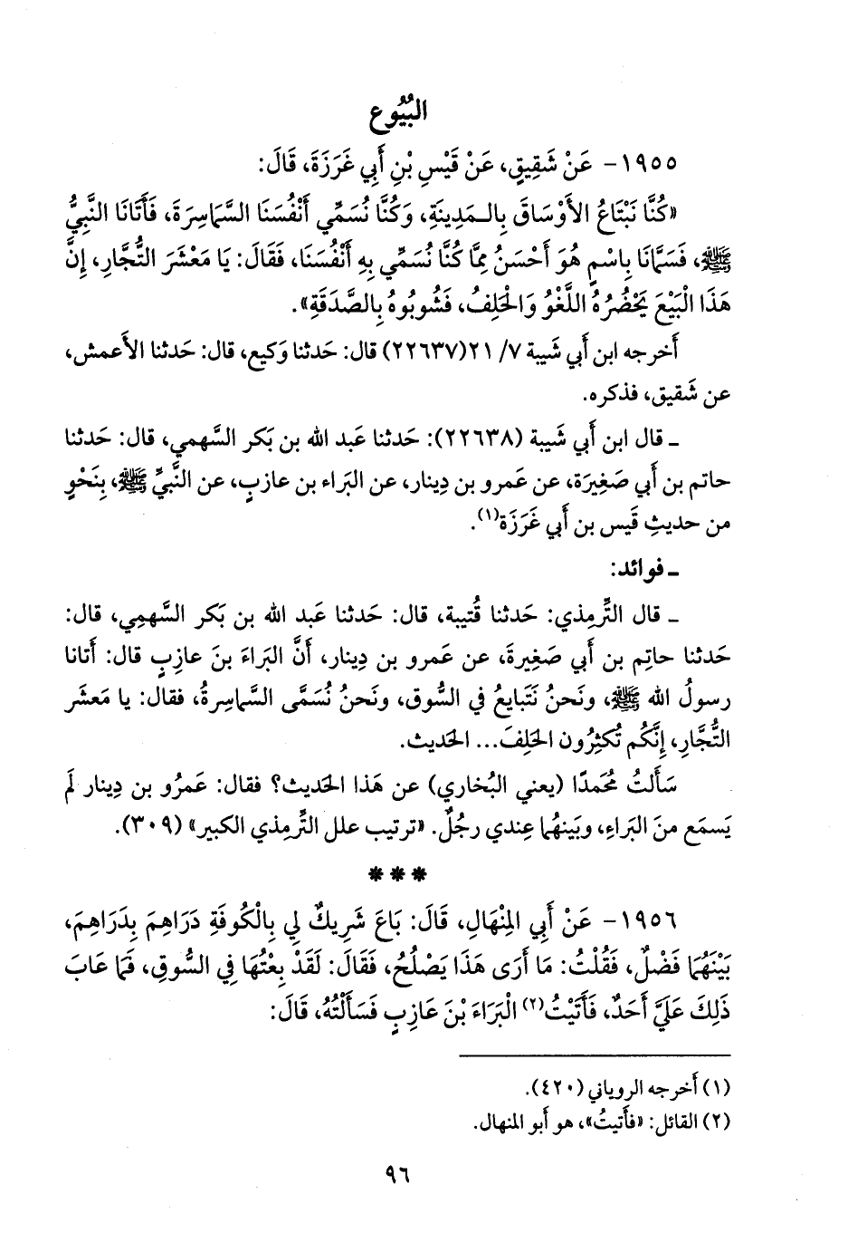 - قلنا: إِسناده ضعيفٌ؛ قال التِّرمِذي: حدثنا قتيبة، قال: حدثنا عبد الله بن بكر السَّهمي، قال: حدثنا حاتم بن أَبي صَغيرة، عن عَمرو بن دينار، أَن البراء بن عازب قال: أَتانا رسول الله صَلى الله عَليه وسَلم ونحن نتبايع في السوق، ونحن نُسَمَّى السماسرة، فقال: يا معشر التجار، إِنكم تُكثرون الحَلِف، الحديثَ.