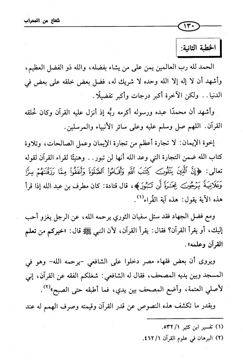 إخوة الإيمان: لا تجارة أعظم من تجارة الإيمان وعمل الصالحات، وتلاوة كتاب الله ضمن التجارة التي وعد الله أنها لن تبور .. وهنيئًا لقراء القرآن لقوله تعالى: {إِنَّ الَّذِينَ يَتْلُونَ كِتَابَ اللَّهِ وَأَقَامُوا الصَّلاةَ وَأَنفَقُوا مِمَّا رَزَقْنَاهُمْ سِرًّا وَعَلانِيَةً يَرْجُونَ تِجَارَةً لَّن تَبُورَ}، قال قتادة: كان مطرف بن عبد الله إذا قرأ هذه الآية يقول: هذه آية القُراء (¬1).