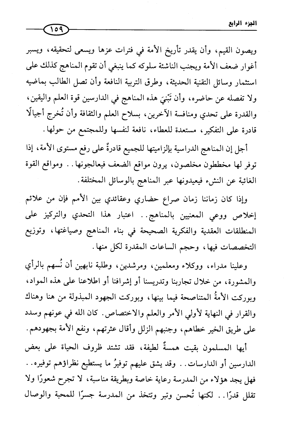 ويصون القيم، وأن يقدر تأريخ الأمة في فترات عزها ويسعى لتحقيقه، ويسبر أغوار ضعف الأمة ويجنب الناشئة سلوكه كما ينبغي أن تقوم المناهج كذلك على استثمار وسائل التقنية الحديثة، وطرق التربية النافعة وأن تصل الطالب بماضيه ولا تفصله عن حاضره، وأن تَبْنيَ هذه المناهج في الدارسين قوة العلم واليقين، والقدرة على تحدي ومنافسة الآخرين، بسلاح العلم والثقافة وأن تُخرج أجيالًا قادرة على التفكير، مستعدة للعطاء، نافعة لنفسها وللمجتمع من حولها.