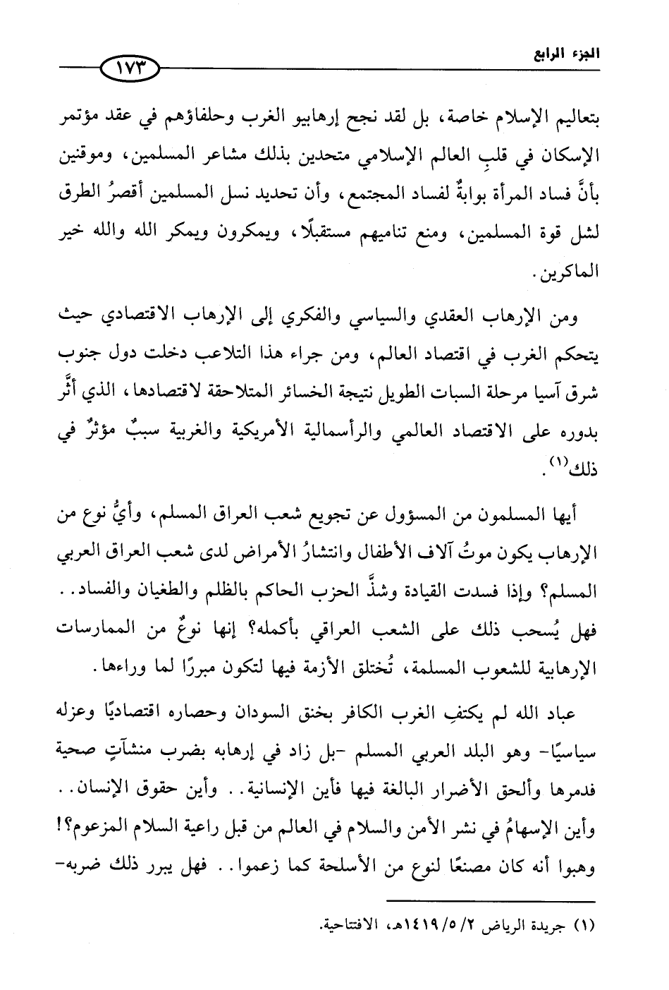 أيها المسلمون من المسؤول عن تجويع شعب العراق المسلم، وأيُّ نوع من الإرهاب يكون موتُ آلاف الأطفال وانتشارُ الأمراض لدى شعب العراق العربي المسلم؟ وإذا فسدت القيادة وشذَّ الحزب الحاكم بالظلم والطغيان والفساد .. فهل يُسحب ذلك على الشعب العراقي بأكمله؟ إنها نوعٌ من الممارسات الإرهابية للشعوب المسلمة، تُختلق الأزمة فيها لتكون مبررًا لما وراءها.