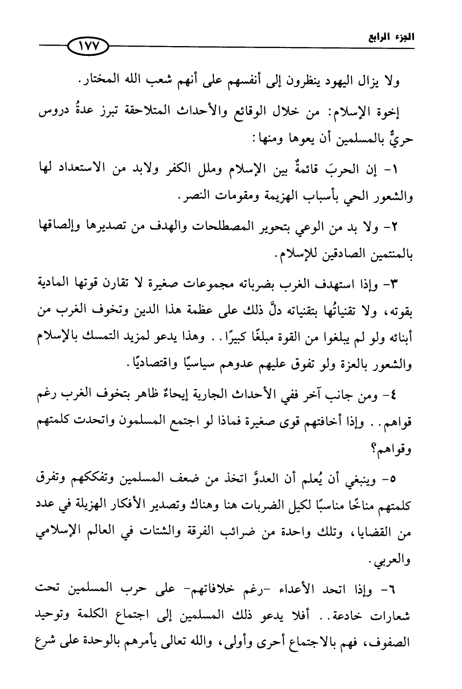 1 - إن الحربَ قائمةٌ بين الإسلام وملل الكفر ولابد من الاستعداد لها والشعور الحي بأسباب الهزيمة ومقومات النمو.
