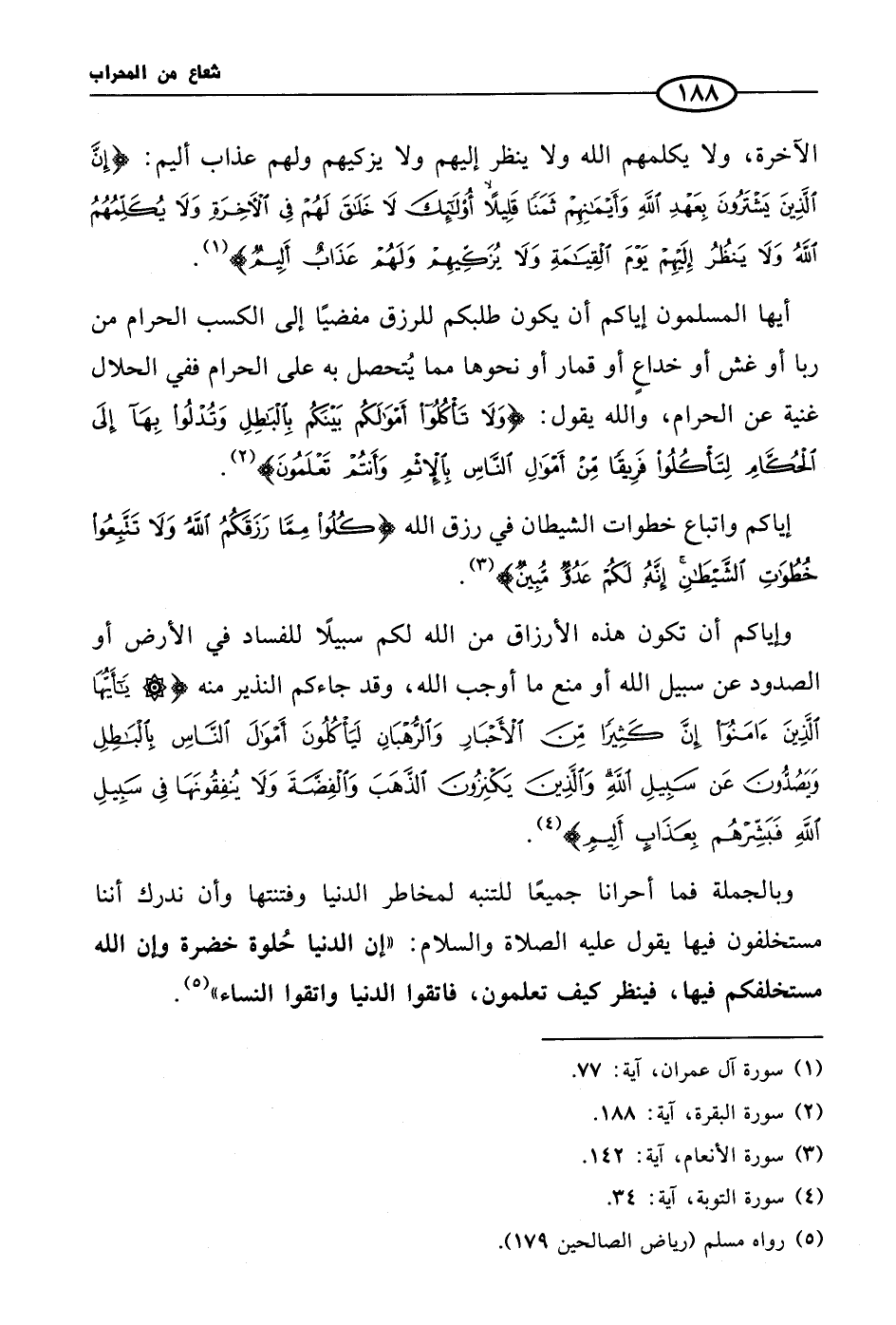 أيها المسلمون إياكم أن يكون طلبكم للرزق مفضيًا إلى الكسب الحرام من ربا أو غش أو خداعٍ أو قمار أو نحوها مما يُتحصل به على الحرام ففي الحلال غنية عن الحرام، والله يقول: {وَلاَ تَأْكُلُوا أَمْوَالَكُم بَيْنَكُم بِالْبَاطِلِ وَتُدْلُوا بِهَا إِلَى الْحُكَّامِ لِتَأْكُلُوا فَرِيقًا مِّنْ أَمْوَالِ النَّاسِ بِالإِثْمِ وَأَنتُمْ تَعْلَمُونَ} (¬2).