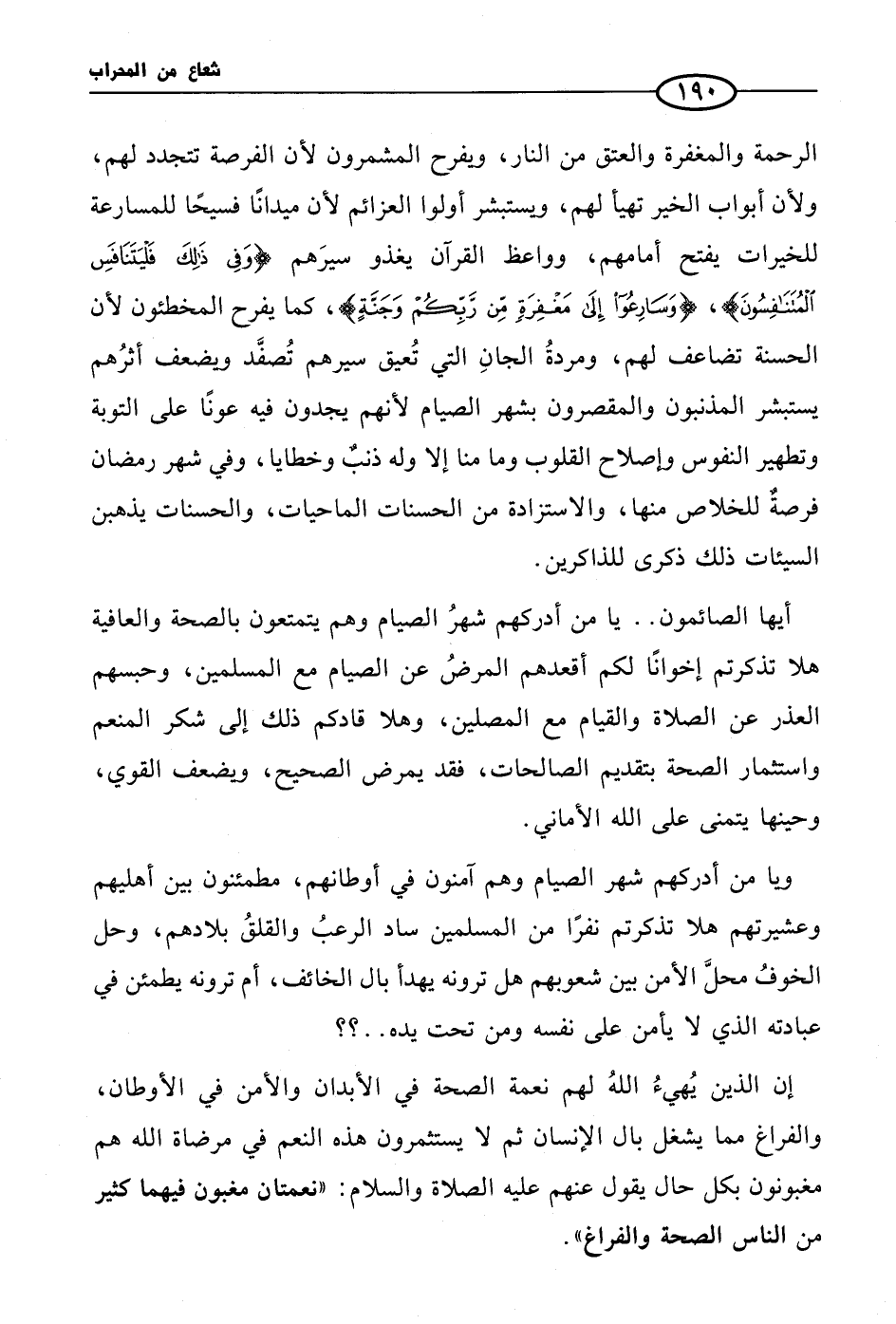 أيها الصائمون .. يا من أدركهم شهرُ الصيام وهم يتمتعون بالصحة والعافية هلا تذكرتم إخوانًا لكم أقعدهم المرضُ عن الصيام مع المسلمين، وحبسهم العذر عن الصلاة والقيام مع المصلين، وهلا قادكم ذلك إلى شكر المنعم واستثمار الصحة بتقديم الصالحات، فقد يمرض الصحيح، ويضعف القوي، وحينها يتمنى على الله الأماني.