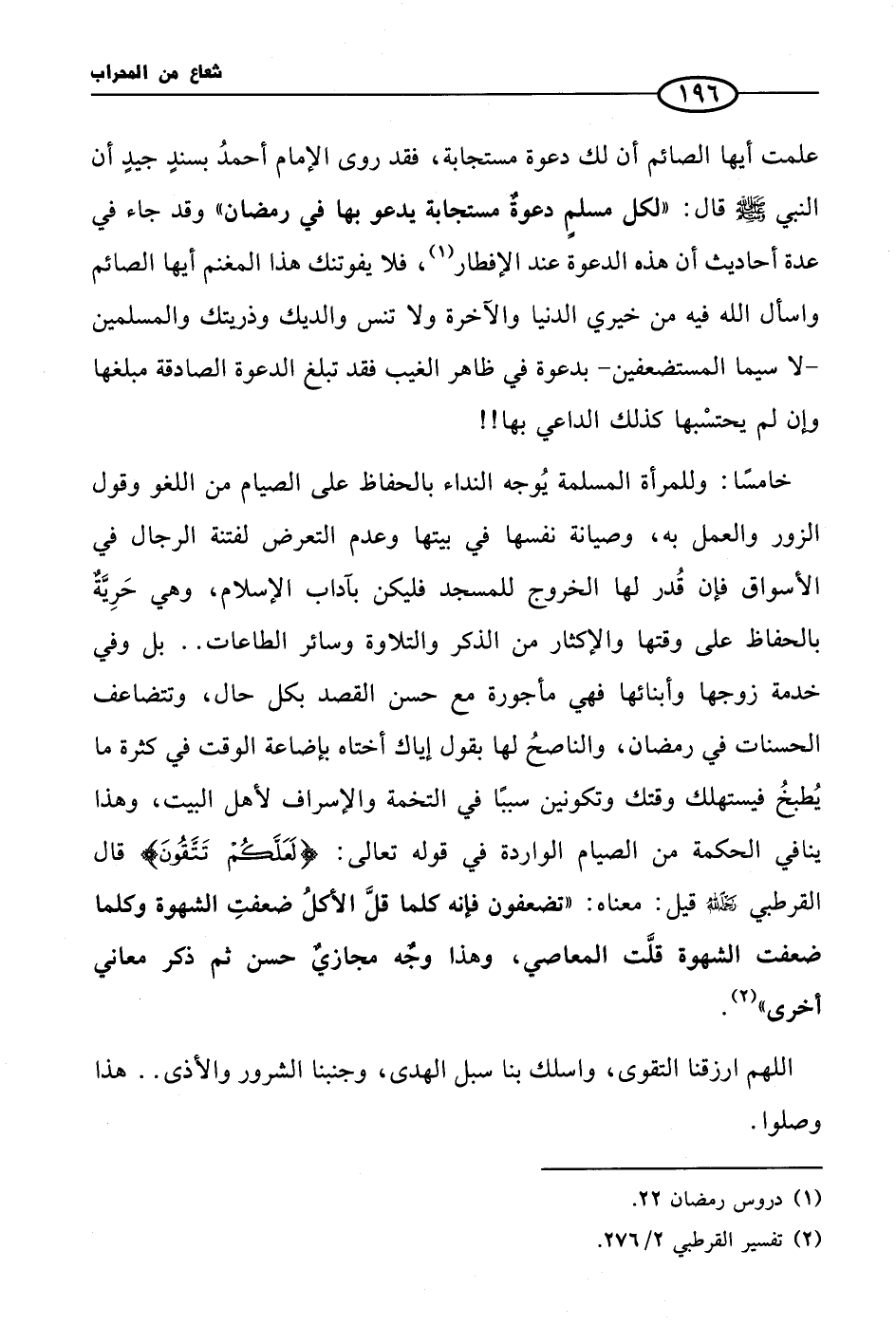 خامسًا: وللمرأة المسلمة يُوجه النداء بالحفاظ على الصيام من اللغو وقول الزور والعمل به، وصيانة نفسها في بيتها وعدم التعرض لفتنة الرجال في الأسواق فإن قُدر لها الخروج للمسجد فليكن بآداب الإسلام، وهي حَرِيَّةٌ بالحفاظ على وقتها والإكثار من الذكر والتلاوة وسائر الطاعات .. بل وفي خدمة زوجها وأبنائها فهي مأجورة مع حسن القصد بكل حال، وتتضاعف الحسنات في رمضان، والناصحُ لها بقول إياك أختاه بإضاعة الوقت في كثرة ما يُطبخُ فيستهلك وقتك وتكونين سببًا في التخمة والإسراف لأهل البيت، وهذا ينافي الحكمة من الصيام الواردة في قوله تعالى: {لَعَلَّكُمْ تَتَّقُونَ} قال القرطبي رحمه الله قيل: معناه: «تضعفون فإنه كلما قلَّ الأكلُ ضعفتِ الشهوة وكلما ضعفت الشهوة قلَّت المعاصي، وهذا وجهٌ مجازيٌ حسن ثم ذكر معاني أخرى» (¬2).