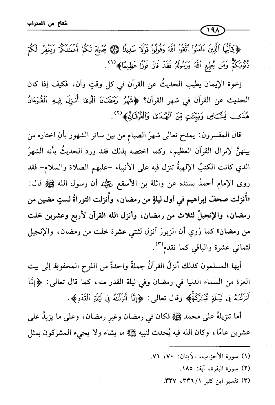 قال المفسرون: يمدح تعالى شهرَ الصيامِ من بين سائر الشهور بأنِ اختاره من بينهنَّ لإنزال القرآن العظيم، وكما اختصه بذلك فقد ورد الحديثُ بأنه الشهرُ الذي كانت الكتبُ الإلهيةُ تنزل فيه على الأنبياء - عليهم الصلاة والسلام- فقد روى الإمام أحمدُ بسنده عن واثلة بن الأسقع رضي الله عنه أن رسول الله صلى الله عليه وسلم قال: «أُنزلت صحفُ إبراهيم في أول ليلةٍ من رمضان، وأُنزلت التوراةُ لستٍ مضين من رمضان، والإنجيلُ لثلاث من رمضان، وأنزل الله القرآن لأربع وعشرين خلت من رمضان» كما رُوي أن الزبورَ أنزل لثنتي عشرة خلت من رمضان، والإنجيل لثماني عشرة والباقي كما تقدم (¬3).