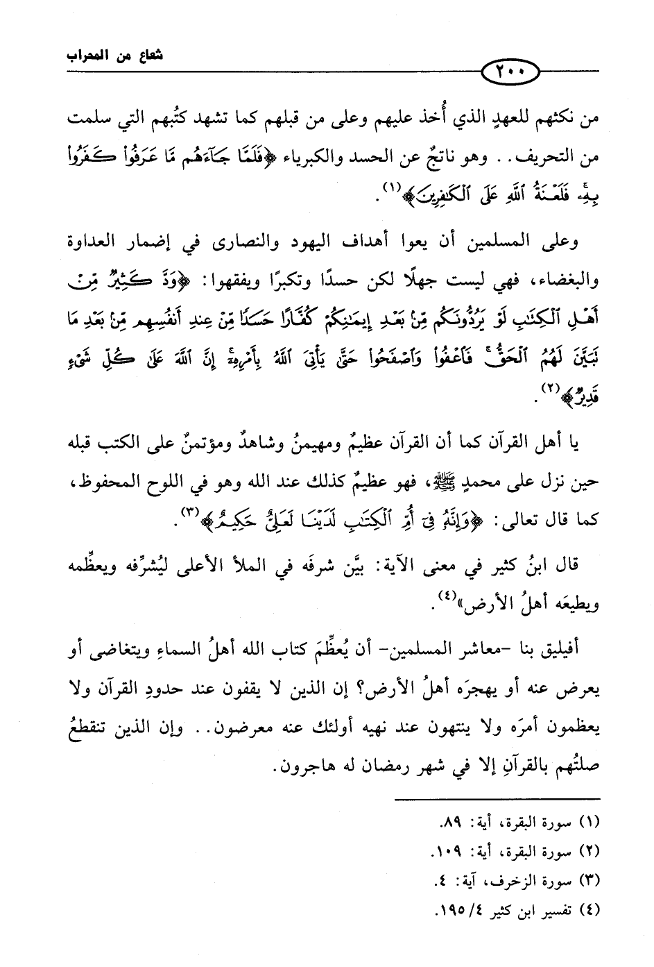 أفيليق بنا- معاشر المسلمين- أن يُعظِّمَ كتاب الله أهلُ السماءِ ويتغاضى أو يعرض عنه أو يهجرَه أهلُ الأرض؟ إن الذين لا يقفون عند حدودِ القرآن ولا يعظمون أمرَه ولا ينتهون عند نهيه أولئك عنه معرضون .. وإن الذين تنقطعُ صلتُهم بالقرآنِ إلا في شهر رمضان له هاجرون.