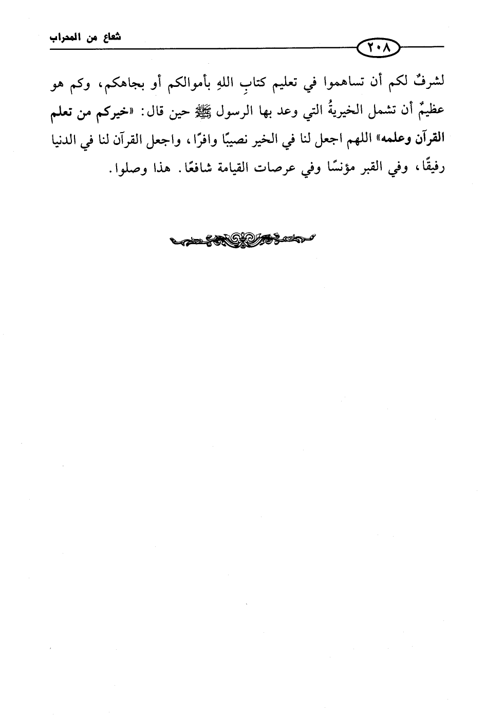 لشرفٌ لكم أن تساهموا في تعليم كتابِ اللهِ بأموالكم أو بجاهكم، وكم هو عظيمٌ أن تشمل الخيريةُ التي وعد بها الرسول صلى الله عليه وسلم حين قال: «خيركم من تعلم القرآن وعلمه» اللهم اجعل لنا في الخير نصيبًا وافرًا، واجعل القرآن لنا في الدنيا رفيقًا، وفي القبر مؤنسًا وفي عرصات القيامة شافعًا. هذا وصلوا.