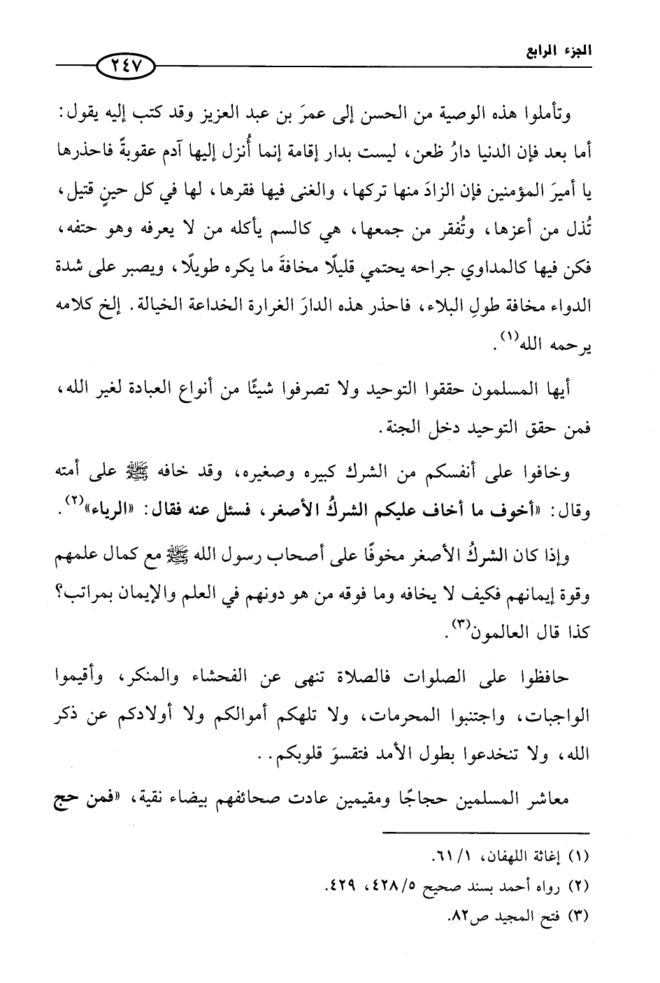 وتأملوا هذه الوصية من الحسن إلى عمرَ بن عبد العزيز وقد كتب إليه يقول: أما بعد فإن الدنيا دارُ ظعن، ليست بدار إقامة إنما أُنزل إليها آدم عقوبةً فاحذرها يا أميرَ المؤمنين فإن الزادَ منها تركها، والغنى فيها فقرها، لها في كل حينٍ قتيل، تُذل من أعزها، وتُفقر من جمعها، هي كالسم يأكله من لا يعرفه وهو حتفه، فكن فيها كالمداوي جراحه يحتمي قليلًا مخافةَ ما يكره طويلًا، ويصبر على شدة الدواء مخافة طولِ البلاء، فاحذر هذه الدارَ الغرارة الخداعة الخيالة. إلخ كلامه يرحمه الله (¬1).