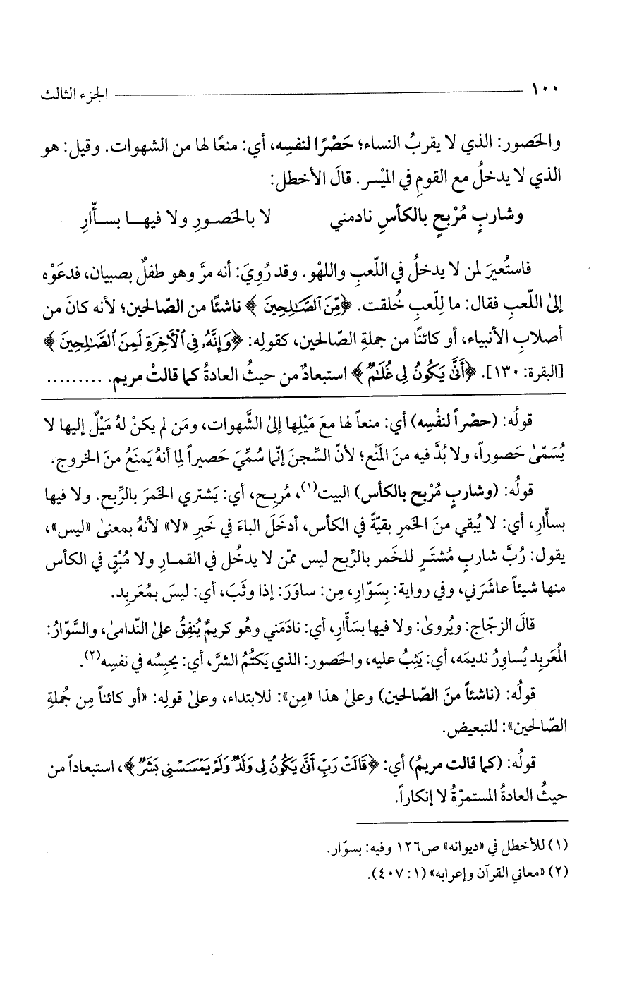 فاستعير لمن لا يدخل في اللعب واللهو. وقد روي: أنه مرّ وهو طفل بصبيان فدعوه إلى اللعب فقال: ما للعب خلقت (مِنَ الصَّالِحِينَ) ناشئًا من الصالحين؛ لأنه كان من أصلاب الأنبياء، أو كائنا من جملة الصالحين كقوله: (وَإِنَّهُ فِي الْآخِرَةِ لَمِنَ الصَّالِحِينَ). [البقرة: 130] (أَنَّى يَكُونُ لِي غُلامٌ) استبعاد من حيث العادة كما قالت مريم