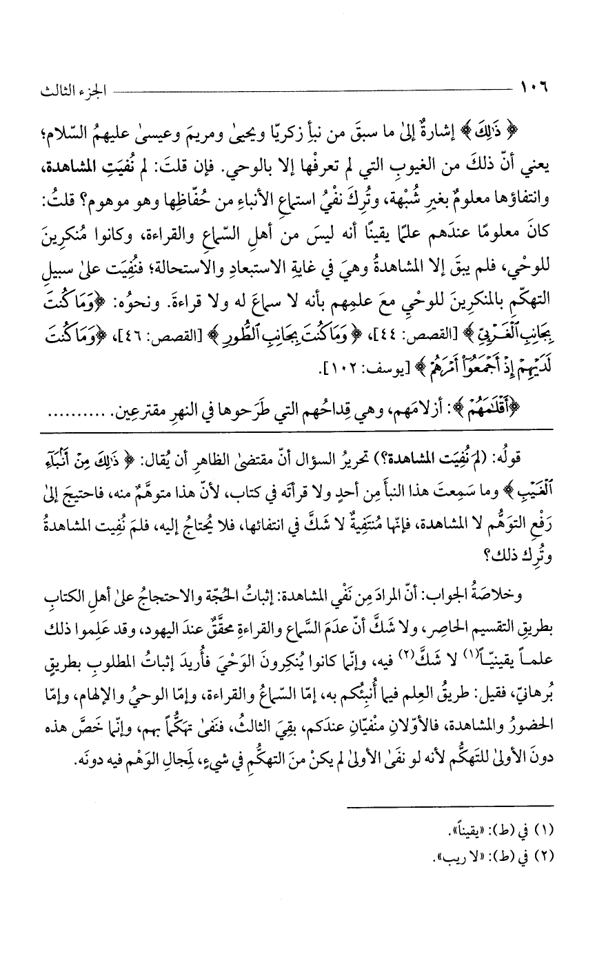 وخلاصة الجواب: أن المراد من نفي المشاهدة: إثبات الحجة والاحتجاج على أهل الكتاب بطريق التقسيم الحاصر، ولاشك أن عدم السماع والقراءة محقق عند اليهود، وقد علموا ذلك علماً يقينياً لاشك فيه، وإنما كانوا ينكرون الوحي فأردي إثبات المطلوب بطريق برهاني، فقيل: طريق العلم فيما أنبئكم به، إما السماع والقراءة، وإما الوحي والإلهام، وإما الحضور والمشاهدة، فالأولان منفيان عندكم، بقي الثالث، فنفى تهكماً بهم، وإنما خص هذه دون الأولى للتهكم لأنه لو نفى الأولى لم يكن من التهكم في شيء، لمجال الوهم فيه دونه.