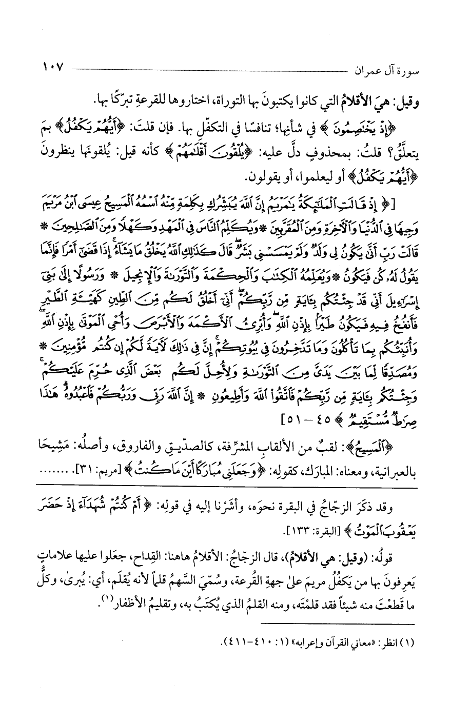 (إِذْ قالَتِ الْمَلائِكَةُ يا مَرْيَمُ إِنَّ اللَّهَ يُبَشِّرُكِ بِكَلِمَةٍ مِنْهُ اسْمُهُ الْمَسِيحُ عِيسَى ابْنُ مَرْيَمَ وَجِيهاً فِي الدُّنْيا وَالْآخِرَةِ وَمِنَ الْمُقَرَّبِينَ (45) وَيُكَلِّمُ النَّاسَ فِي الْمَهْدِ وَكَهْلاً وَمِنَ الصَّالِحِينَ (46) قالَتْ رَبِّ أَنَّى يَكُونُ لِي وَلَدٌ وَلَمْ يَمْسَسْنِي بَشَرٌ قالَ كَذلِكِ اللَّهُ يَخْلُقُ ما يَشاءُ إِذا قَضى أَمْراً فَإِنَّما يَقُولُ لَهُ كُنْ فَيَكُونُ (47) وَيُعَلِّمُهُ الْكِتابَ وَالْحِكْمَةَ وَالتَّوْراةَ وَالْإِنْجِيلَ (48) وَرَسُولاً إِلى بَنِي إِسْرائِيلَ أَنِّي قَدْ جِئْتُكُمْ بِآيَةٍ مِنْ رَبِّكُمْ أَنِّي أَخْلُقُ لَكُمْ مِنَ الطِّينِ كَهَيْئَةِ الطَّيْرِ فَأَنْفُخُ فِيهِ فَيَكُونُ طَيْراً بِإِذْنِ اللَّهِ وَأُبْرِئُ الْأَكْمَهَ وَالْأَبْرَصَ وَأُحْيِ الْمَوْتى بِإِذْنِ اللَّهِ وَأُنَبِّئُكُمْ بِما تَاكُلُونَ وَما تَدَّخِرُونَ فِي بُيُوتِكُمْ إِنَّ فِي ذلِكَ لَآيَةً لَكُمْ إِنْ كُنْتُمْ مُؤْمِنِينَ (49) وَمُصَدِّقاً لِما بَيْنَ يَدَيَّ مِنَ التَّوْراةِ وَلِأُحِلَّ لَكُمْ بَعْضَ الَّذِي حُرِّمَ عَلَيْكُمْ وَجِئْتُكُمْ بِآيَةٍ مِنْ رَبِّكُمْ فَاتَّقُوا اللَّهَ وَأَطِيعُونِ (50) إِنَّ اللَّهَ رَبِّي وَرَبُّكُمْ فَاعْبُدُوهُ هذا صِراطٌ مُسْتَقِيمٌ (51)