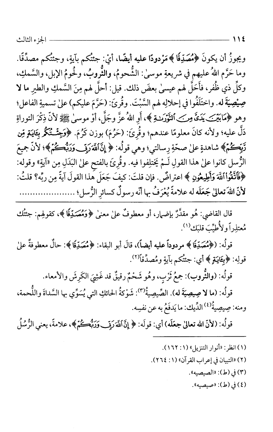 ويجوز أن يكون (مُصَدِّقاً) مردودا عليه أيضا، أي جئتكم بآية وجئتكم مصدقًا. وما حرم اللَّه عليهم في شريعة موسى: الشحوم، والثروب، ولحوم الإبل، والسمك، وكل ذي ظفر، فأحل لهم عيسى بعض ذلك. قيل: أحل لهم من السمك والطير ما لا صيصية له. واختلفوا في إحلاله لهم السبت. وقرئ (حرم عليكم) على تسمية الفاعل، وهو (ما بين يدىّ من التوراة)، أو اللَّه عزّ وجلّ، أو موسى عليه السلام؛ لأن ذكر التوراة دل عليه؛ ولأنه كان معلوماً عندهم. وقرئ: "حرم"، بوزن كرم (وَجِئْتُكُمْ بِآيَةٍ مِنْ رَبِّكُمْ) شاهدة على صحة رسالتي وهي قوله (إِنَّ اللَّهَ رَبِّي وَرَبُّكُمْ)؛ لأنّ جميع الرسل كانوا على هذا القول لم يختلفوا فيه: وقرئ بالفتح على البدل من (آيَةٍ). وقوله: (فَاتَّقُوا اللَّهَ وَأَطِيعُونِ) اعتراض، فإن قلت: كيف جعل هذا القول آية من ربه؟ قلت: لأنّ اللَّه تعالى جعله له علامة يعرف بها أنه رسول كسائر الرسل،
