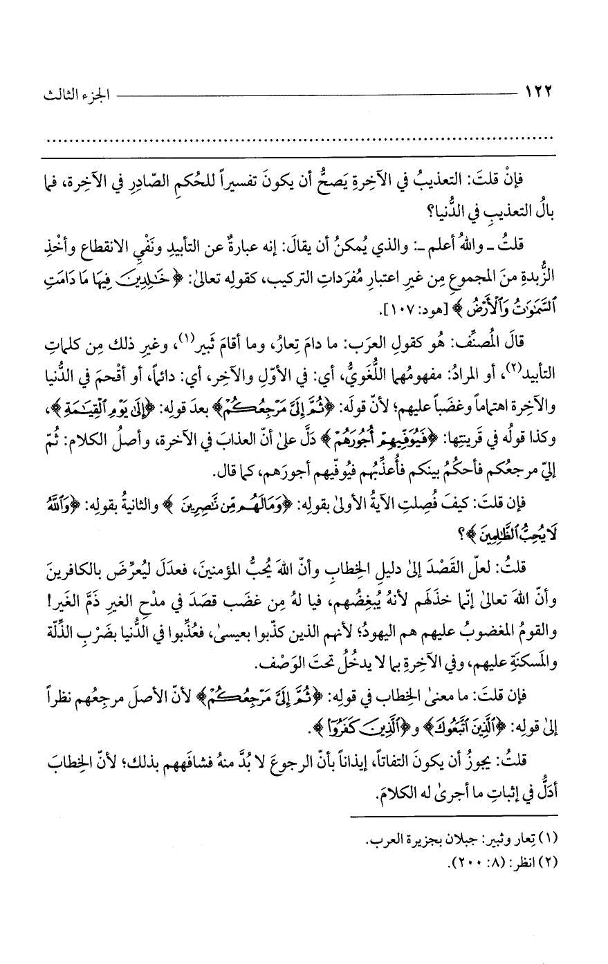 قال المصنف: هو كقول العرب: ما دام تعار، وما أقام ثبير، وغير ذلك من كلمات التأبيد، أو المراد: مفهومهما اللغوي، أي: في الأول والآخر، أي: دائماً، أو أقحم في الدنيا والآخرة اهتماماً وغضباً عليهم؛ لأن قوله: (ثُمَّ إِلَيَّ مَرْجِعُكُمْ) بعد قوله: (إِلَى يَوْمِ الْقِيَامَةِ)، وكذا قوله في قرينتها: (فَيُوَفِّيهِمْ أُجُورَهُمْ) دل على أن العذاب في الآخرة، وأصل الكلام: ثم إلي مرجعكم فأحكم بينكم فأعذبهم فيوفيهم أجورهم، كما قال.