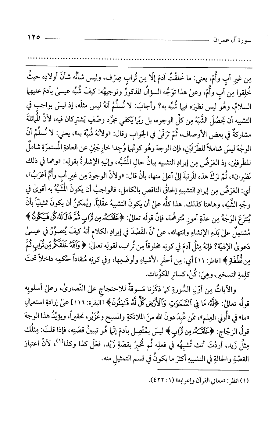 والآيات من أول السورة كما ذكرنا مسوقة للاحتجاج على النصارى، وعلى أسلوبه قوله تعالى: (لَهُ مَا فِي السَّمَوَاتِ وَالأَرْضِ كُلٌّ لَهُ قَانِتُونَ) [البقرة: 116] على إرادة استعمال "ما" في "أولي العلم"، ممن عبد دون الله من الملائكة والمسيح وعزير، تحقيراً، ويؤيد هذا الوجه قول الزجاج: (خَلَقَهُ مِنْ تُرَابٍ) ليس بمتصل بآدم إنما هو تبيين قصته، فإذا قلت: مثلك مثل زيد، أردت أنك تشبهه في فعله ثم تخبر بقصة زيد، فعل كذا وكذا، لأن اعتبار القصة والحالة في التشبيه أكثر ما يكون في قسم التمثيل منه.