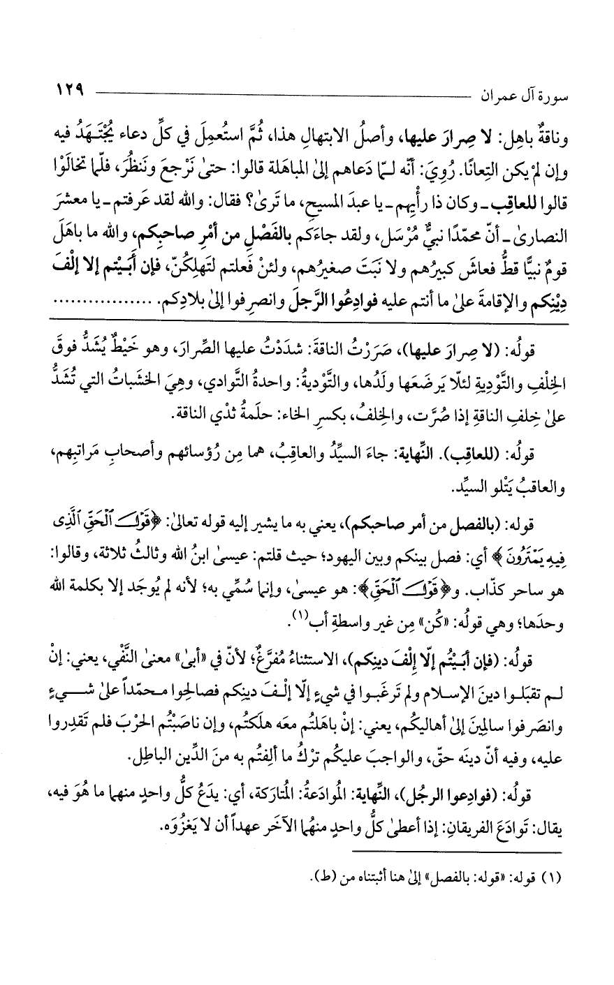 وناقة باهل: لا صرار عليها، وأصل الابتهال هذا، ثم استعمل في كل دعاء يجتهد فيه وإن لم يكن التعانا. روى: «أنه لما دعاهم إلى المباهلة قالوا: حتى نرجع وننظر، فلما تخالوا قالوا للعاقب ـ وكان ذا رأيهم ـ يا عبد المسيح، ما ترى؟ فقال: واللَّه لقد عرفتم يا معشر النصارى ـ أنّ محمداً نبيٌ مرسل، ولقد جاءكم بالفصل من أمر صاحبكم، واللَّه ما باهل قوم نبيًّا قط فعاش كبيرهم ولا نبت صغيرهم، ولئن فعلتم لتهلكنّ فإن أبيتم إلا إلف دينكم والإقامة على ما أنتم عليه، فوادعوا الرجل وانصرفوا إلى بلادكم،