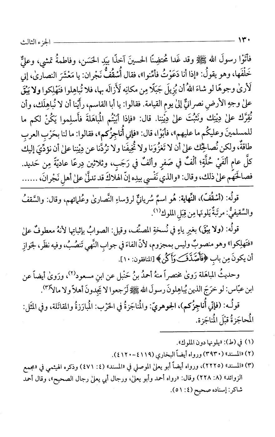 وحديث المباهلة روى مختصراً منه أحمد بن حنبل عن ابن مسعود، وروى أيضاً عن ابن عباس: لو خرج الذين يباهلون رسول الله صلى الله عليه وسلم لرجعوا لا يجدون أهلاً ولا مالاً.