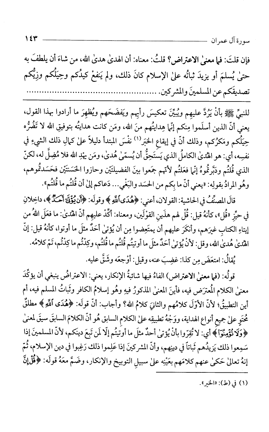 فإن قلت: فما معنى الاعتراض؟ قلت: معناه: أنّ الهدى هدى اللَّه، من شاء أن يلطف به حتى يسلم أو يزيد ثباته على الإسلام، كان ذلك، ولم ينفع كيدكم وحيلكم وزيكم تصديقكم عن المسلمين والمشركين، ...