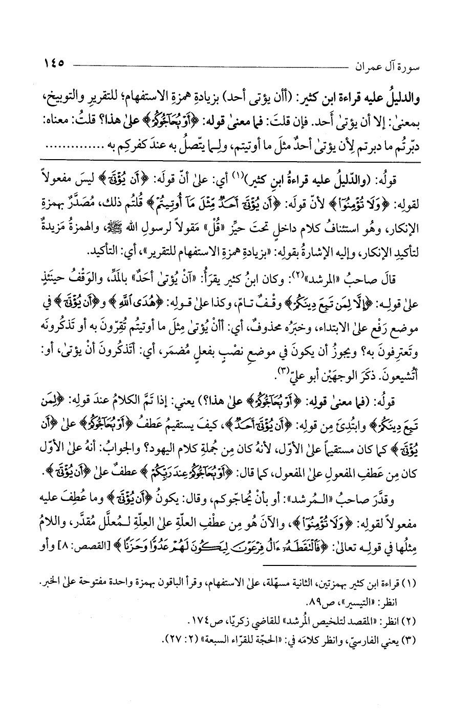قال صاحب "المرشد": وكان ابن كثير يقرأ: "آن يؤتى أحد" بالمد، والوقف حينئذ على قوله: (إِلاَّ لِمَنْ تَبِعَ دِينَكُمْ) وقف تام، وكذا على قوله: (هُدَى اللَّهِ) و (أَنْ يُؤْتَى) في موضع رفع على الابتداء، وخبره محذوف، أي: أأن يؤتى مثل ما أوتيتم تقرون به أو تذكرونه وتعترفون به؟ ويجوز أن يكون في موضع نصب بفعل مضمر، أي: أتذكرون أن يؤتى، أو: أتشيعون. ذكر الوجهين أبو علي.