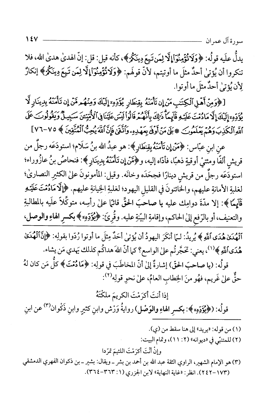 (وَمِنْ أَهْلِ الْكِتابِ مَنْ إِنْ تَامَنْهُ بِقِنْطارٍ يُؤَدِّهِ إِلَيْكَ وَمِنْهُمْ مَنْ إِنْ تَامَنْهُ بِدِينارٍ لا يُؤَدِّهِ إِلَيْكَ إِلاَّ ما دُمْتَ عَلَيْهِ قائِماً ذلِكَ بِأَنَّهُمْ قالُوا لَيْسَ عَلَيْنا فِي الْأُمِّيِّينَ سَبِيلٌ وَيَقُولُونَ عَلَى اللَّهِ الْكَذِبَ وَهُمْ يَعْلَمُونَ (75) بَلى مَنْ أَوْفى بِعَهْدِهِ وَاتَّقى فَإِنَّ اللَّهَ يُحِبُّ الْمُتَّقِينَ) (76)