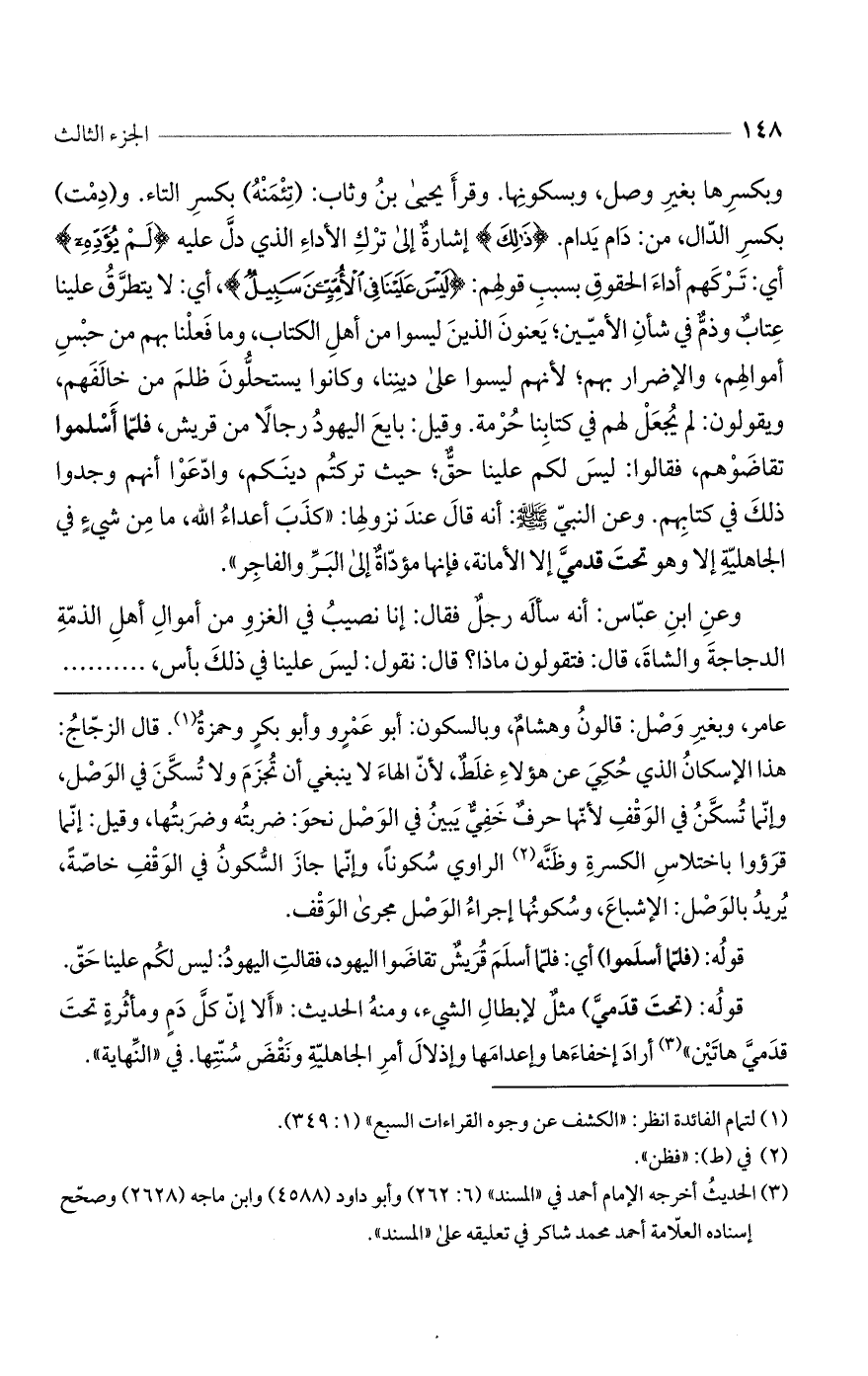 وبكسرها بغير وصل، وبسكونها. وقرأ يحيى بن وثاب: تئمنه، بكسر التاء. و (دمت) بكسر الدال من دام يدام (ذلِكَ) إشارة إلى ترك الأداء الذي دلّ عليه (لم يؤدّه)، أي: تركهم أداء الحقوق بسبب قولهم (لَيْسَ عَلَيْنا فِي الْأُمِّيِّينَ سَبِيلٌ)، أي: لا يتطرّق علينا عتاب وذم في شأن الأميين؛ يعنون الذين ليسوا من أهل الكتاب، وما فعلنا بهم من حبس أموالهم، والإضرار بهم؛ لأنهم ليسوا على ديننا، وكانوا يستحلون ظلم من خالفهم ويقولون: لم يجعل لهم في كتابنا حرمة. وقيل: بايع اليهود رجالاً من قريش، فلما أسلموا تقاضوهم فقالوا: