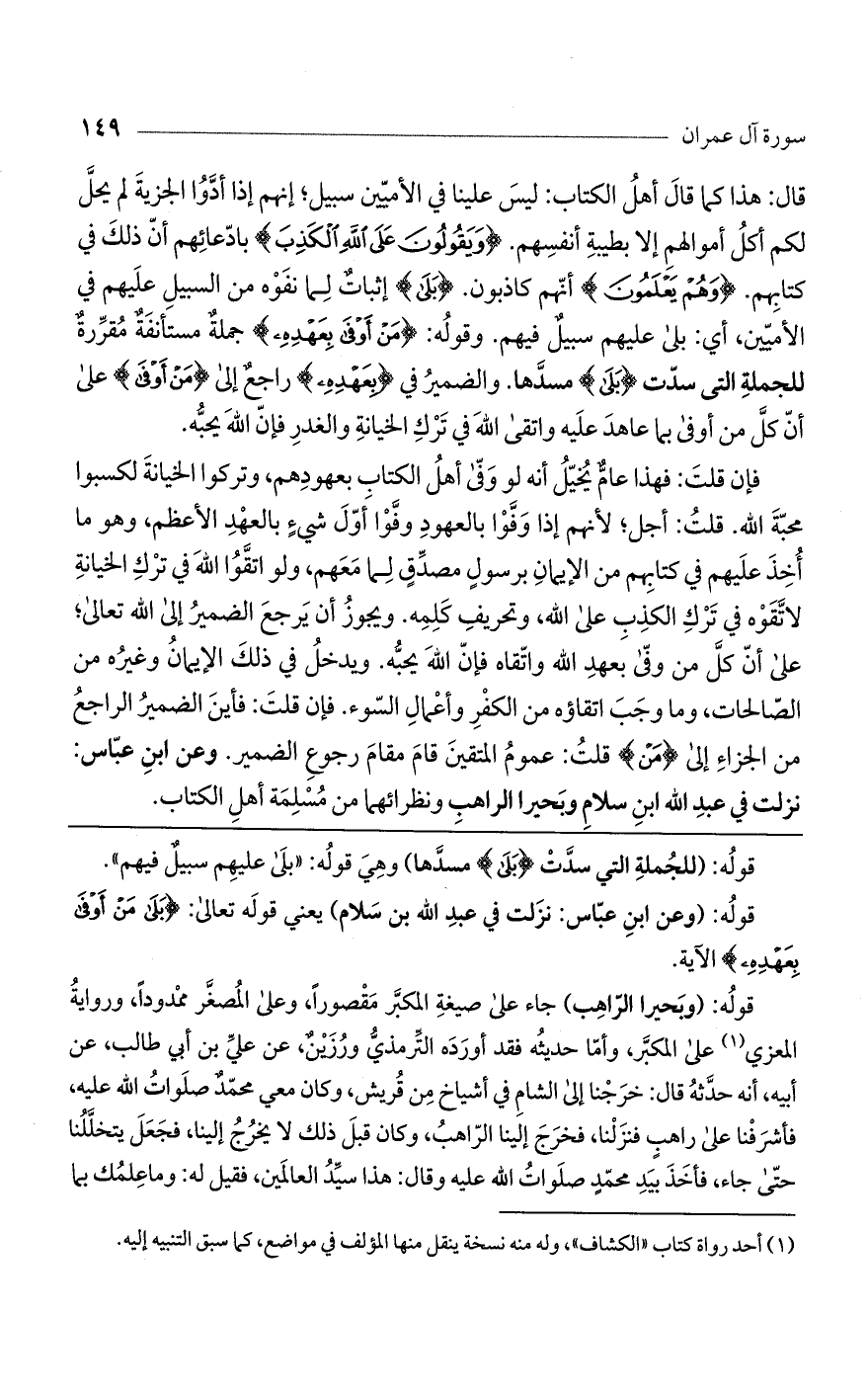 قال: هذا كما قال أهل الكتاب: ليس علينا في الأميين سبيل. إنهم إذا أدّوا الجزية لم يحلّ لكم أكل أموالهم إلا بطيبة أنفسهم، (وَيَقُولُونَ عَلَى اللَّهِ الْكَذِبَ) بادعائهم أن ذلك في كتابهم (وَهُمْ يَعْلَمُونَ) أنهم كاذبون (بَلى) إثبات لما نفوه من السبيل عليهم في الأميين، أي: بلى عليهم سبيل فيهم. وقوله: (مَنْ أَوْفى بِعَهْدِهِ) جملة مستأنفة مقرّرة للجملة التي سدّت (بلى) مسدّها، والضمير في (بعهده) راجع إلى (من أوفى)، على أنّ كل من أوفى بما عاهد عليه واتقى اللَّه في ترك الخيانة والغدر، فإنّ اللَّه يحبه.