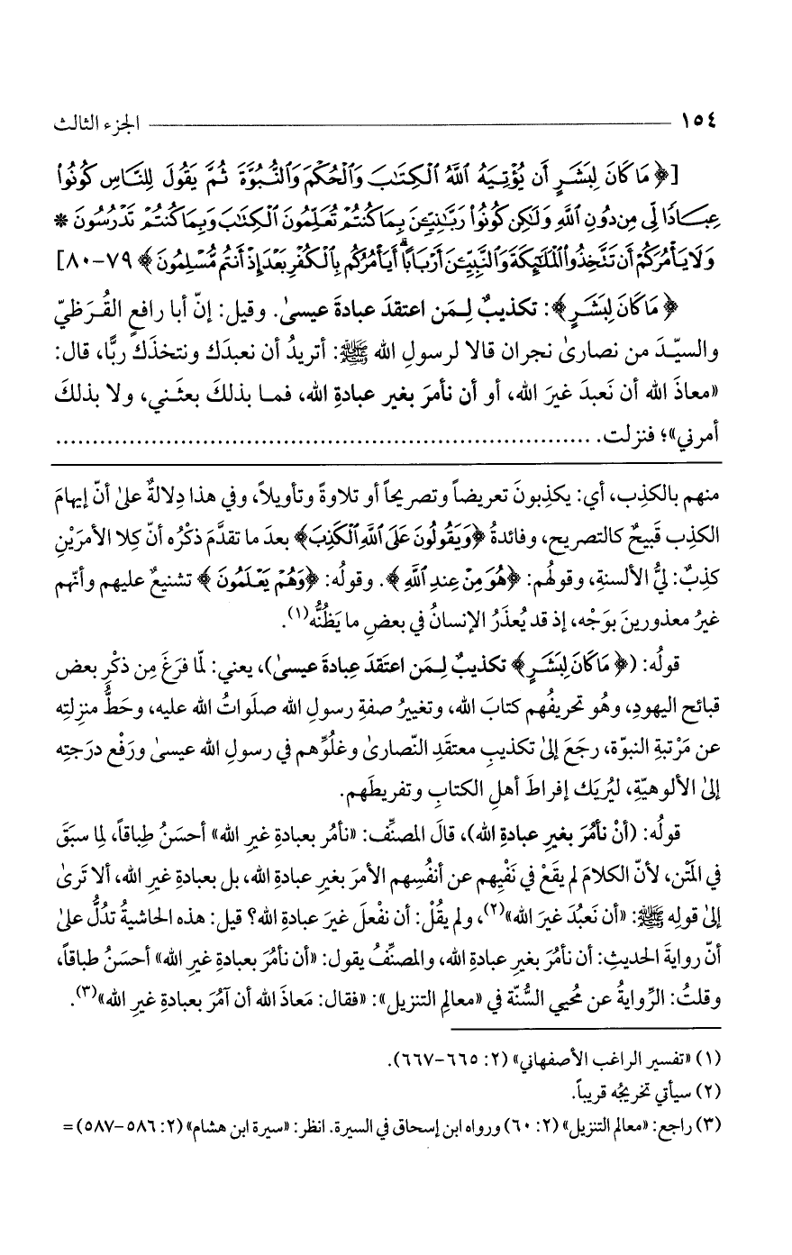 (ما كانَ لِبَشَرٍ أَنْ يُؤْتِيَهُ اللَّهُ الْكِتابَ وَالْحُكْمَ وَالنُّبُوَّةَ ثُمَّ يَقُولَ لِلنَّاسِ كُونُوا عِباداً لِي مِنْ دُونِ اللَّهِ وَلكِنْ كُونُوا رَبَّانِيِّينَ بِما كُنْتُمْ تُعَلِّمُونَ الْكِتابَ وَبِما كُنْتُمْ تَدْرُسُونَ (79) وَلا يَامُرَكُمْ أَنْ تَتَّخِذُوا الْمَلائِكَةَ وَالنَّبِيِّينَ أَرْباباً أَيَامُرُكُمْ بِالْكُفْرِ بَعْدَ إِذْ أَنْتُمْ مُسْلِمُونَ) 79 ـ 80].