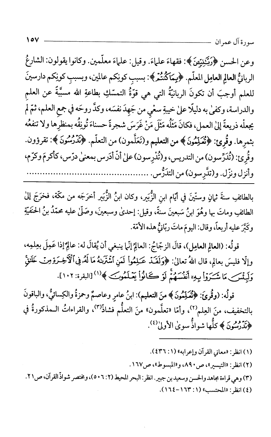 وعن الحسن (ربانيين): فقهاء علماء. وقيل علماء معلمين. وكانوا يقولون: الشارع الرباني: العالم العامل المعلم (بِما كُنْتُمْ) بسبب كونكم عالمين، وبسبب كونكم دارسين للعلم أوجب أن تكون الربانية التي هي قوّة التمسك بطاعة اللَّه مسببة عن العلم والدراسة، وكفى به دليلا على خيبة سعي من جهد نفسه وكدّ روحه في جمع العلم، ثم لم يجعله ذريعة إلى العمل، فكان مثله مثل من غرس شجرة حسناء تونقه بمنظرها ولا تنفعه بثمرها: وقرئ: (تعلمون) من التعليم. و (تعلمون) من التعلم. (تَدْرُسُونَ): تقرءون. وقرئ (تدرسون)، من التدريس. و (تدرسون) على أن أدرس بمعنى درّس كأكرم وكرّم وأنزل ونزَّل.