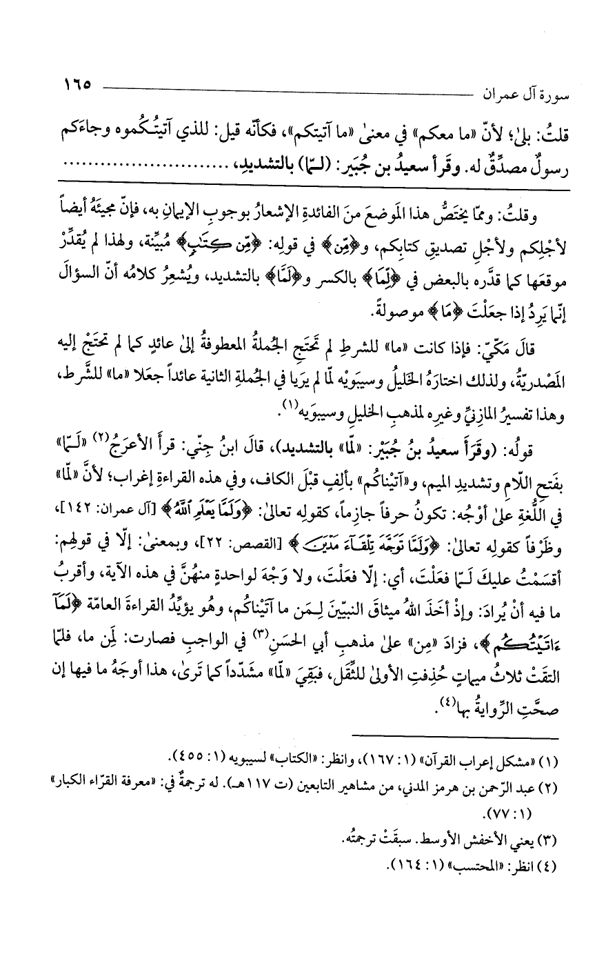 قوله: (وقرأ سعيد بن جبير: "لما" بالتشديد)، قال ابن جني: قرأ الأعرج "لما" بفتح اللام وتشديد الميم، و"آتيناكم" بألف قبل الكاف، وفي هذه القراءة إغراب؛ لأن "لما" في اللغة على أوجه: تكون حرفاً جازماً، تعالى: (وَلَمَّا يَعْلَمْ اللَّهُ) [آل عمران: 142]، وظرفاً كقوله تعالى: (وَلَمَّا تَوَجَّهَ تِلْقَاءَ مَدْيَنَ) [القصص: 22]، وبمعنى: إلا في قولهم: أقسمت عليك لما فعلت، أي: إلا فعلت، ولا وجه لواحدة منهن في هذه الآية، وأقرب ما فيه أن يراد: وإذ أخذ الله ميثاق النبيين لمن ما آتيناكم، وهو يؤيد القراءة العامة (لَمَا آتَيْتُكُمْ)، فزاد "من" على مذهب أبي الحسن في الواجب فصارت: لمن ما، فلما التقت ثلاث ميمات حذفت الأولى للثقل، فبقي "لما" مشدداً كما ترى، هذا أوجه ما فيها إن صحت الرواية بها.