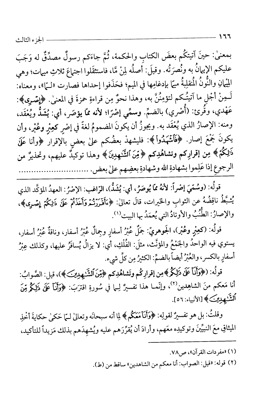 وقرئ: (أصري)، بالضم. وسمى إصراً؛ لأنه مما يؤصر، أي يشدّ ويعقد، ومنه الإصار، الذي يعقد به. ويجوز أن يكون المضموم لغة في أصر كعبر وعبر، وأن يكون جمع إصار. (فَاشْهَدُوا) فليشهد بعضكم على بعض بالإقرار (وَأَنَا عَلى ذلِكُمْ) من إقراركم وتشاهدكم (مِنَ الشَّاهِدِينَ) وهذا توكيد عليهم، وتحذير من الرجوع إذا علموا بشهادة اللَّه وشهادة بعضهم على بعض