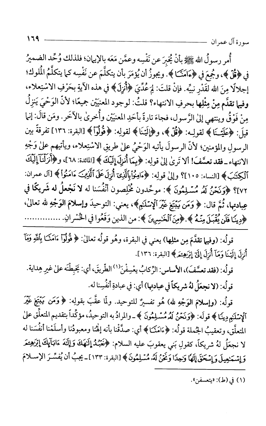 في (قُلْ) وجمع في (آمَنَّا). ويجوز أن يؤمر بأن يتكلم عن نفسه كما يتكلم الملوك؛ إجلالا من اللَّه لقدر نبيه. فإن قلت: لم عدّي (أنزل) في هذه الآية بحرف الاستعلاء، وفيما تقدم من مثلها بحرف الانتهاء؟ قلت: لوجود المعنيين جميعا؛ لأن الوحي ينزل من فوق وينتهي إلى الرسول، فجاء تارة بأحد المعنيين وأخرى بالآخر. ومن قال: إنما قيل (عَلَيْنا) لقوله: (قُلْ)، و (إلينا) لقوله (قُولُوا) [البقرة: 136] تفرقة بين الرسل والمؤمنين؛ لأن الرسول يأتيه الوحى على طريق الاستعلاء، ويأتيهم على وجه الانتهاء، فقد تعسف! ألا ترى إلى قوله: (بِما أُنْزِلَ إِلَيْكَ) [المائدة: 68]، وَ (أَنْزَلْنا إِلَيْكَ الْكِتابَ) [النساء: 105]؟ وإلى قوله: (آمِنُوا بِالَّذِي أُنْزِلَ عَلَى الَّذِينَ آمَنُوا) [آل عمرن: 72]. (وَنَحْنُ لَهُ مُسْلِمُونَ): موحدون مخلصون أنفسنا له لا نجعل له شريكا في عبادتها ثم قال: (وَمَنْ يَبْتَغِ غَيْرَ الْإِسْلامِ)، يعنى التوحيد وإسلام الوجه للَّه تعالى (دِيناً فَلَنْ يُقْبَلَ مِنْهُ). (مِنَ الْخاسِرِينَ) من الذين وقعوا في الخسران