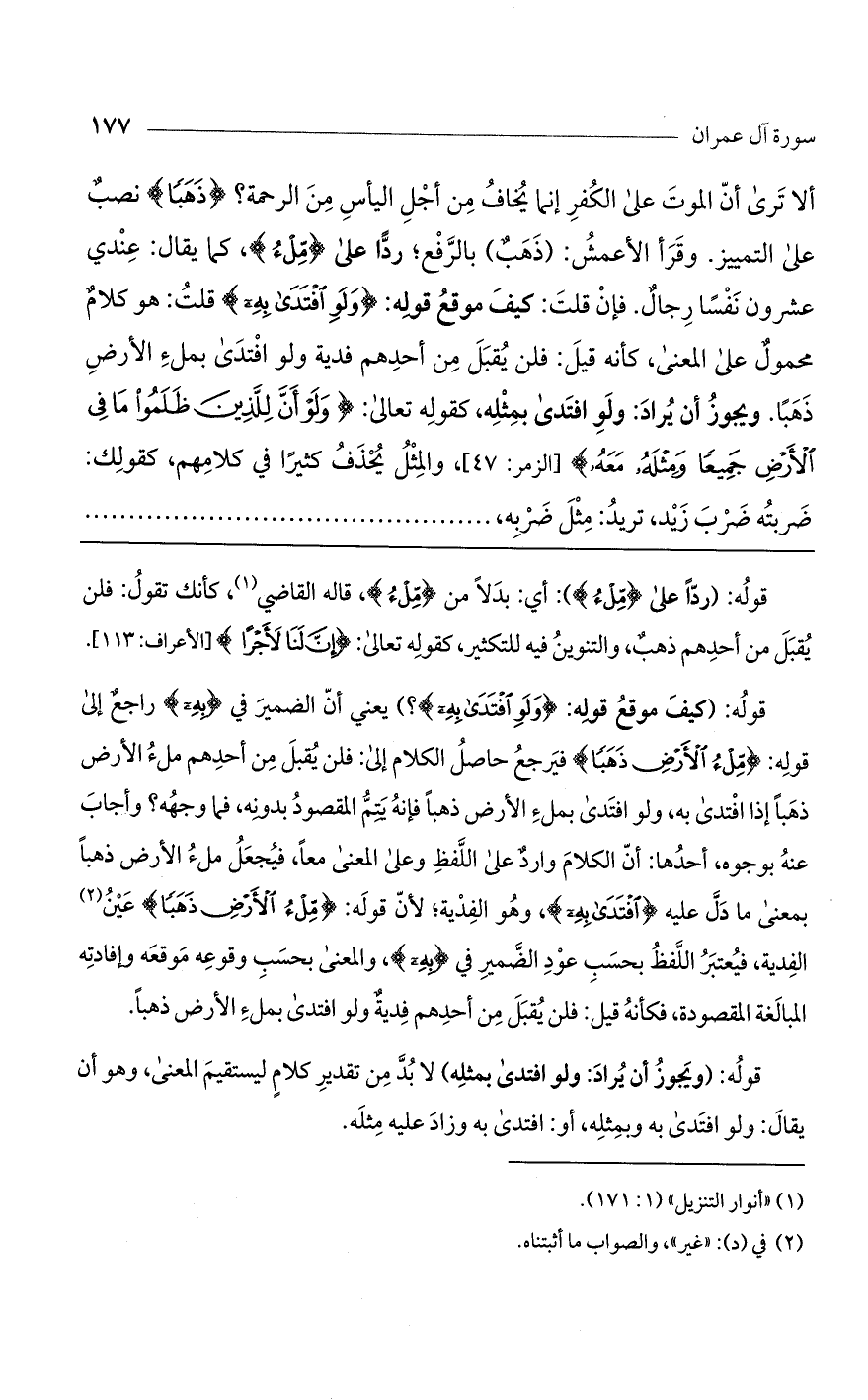 قوله: (رداً على (مِلْءُ)): أي بدلاً من (مِلْءُ)، قاله القاضي، كأنك تقول: فلن يقبل من أحدهم ذهب، والتنوين فيه للتكثير، كقوله تعالى: (إِنَّ لَنَا لأَجْراً) [الأعراف: 113].