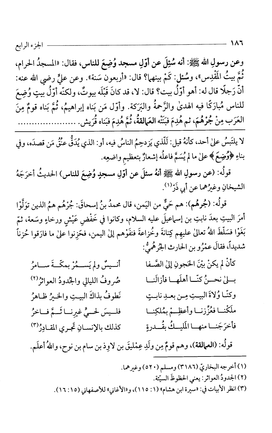 قوله: (جرهم): هم حي من اليمن، قال محمد بن إسحاق: جرهم هم الذين تولوا أمر البيت بعد نابت بن إسماعيل عليه السلام، وكانوا في خفض عيش ورخاء وسعة، ثم بغوا فسلط الله تعالى عليهم كنانة وخزاعة فنفوهم إلى اليمن، فحزنوا على ما فارقوا حزناً شديداً، فقال عمرو بن الحارث الجرهمي: