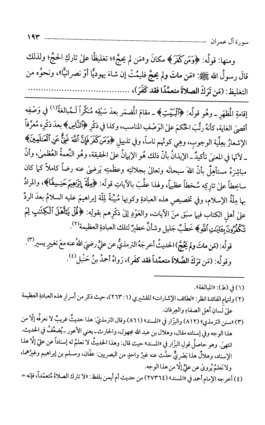 إقامة المظهرـ وهو قوله: (الْبَيْتِ) ـ مقام المضمر بعد سبقه منكراً لمبالغة في وصفه أقصى الغاية، كأنه رتب الحكم على الوصف المناسب، وكذا في ذكر (النَّاسِ) بعد ذكره معرفاً الإشعار بعلية الوجوب، وهي كونهم ناساً، وفي تذييل (وَمَنْ كَفَرَ فَإِنَّ اللَّهَ غَنِيٌّ عَنْ الْعَالَمِينَ) ـ لأنها في المعنى تأكيدـ الإيذان بأن ذلك هو الإيمان على الحقيقة، وهو النعمة العظمى، وأن مباشرة مستأهل بأن الله سبحانه وتعالى بجلالته وعظمته يرضى عنه رضاً كاملاً كما كان ساخطاً على تاركه سخطاً عظيماً، ولهذا عقب بالآيات قوله: (مِلَّةَ إِبْرَاهِيمَ حَنِيفاً)، والمراد بها ملة الإسلام، وفي تخصيص هذه العبادة وكونها مبينة لملة إبراهيم عليه السلام بعد الرد على أهل الكتاب فيما سبق من الآيات، والعود إلى ذكرهم بقوله: (قُلْ يَا أَهْلَ الْكِتَابِ لِمَ تَكْفُرُونَ بِآيَاتِ اللَّهِ) خطب جليل وشأن خطير لتلك العبادة العظيمة.