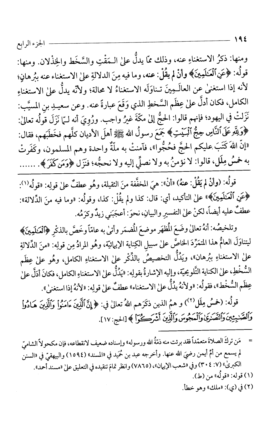 ومنها ذكر الاستغناء عنه، وذلك مما يدل على المقت والسخط والخذلان. ومنها قوله: (عَنِ الْعالَمِينَ) وإن لم يقل عنه، وما فيه من الدلالة على الاستغناء عنه ببرهان؛ لأنه إذا استغنى عن العالمين تناوله الاستغناء لا محالة؛ ولأنه يدل على الاستغناء الكامل، فكان أدلّ على عظم السخط الذي وقع عبارة عنه. وعن سعيد بن المسيب نزلت في اليهود؛ فإنهم قالوا: الحج إلى مكة غير واجب. وروي أنه لما نزل قوله تعالى: (وَلِلَّهِ عَلَى النَّاسِ حِجُّ الْبَيْتِ) جمع رسول اللَّه صلى اللَّه عليه وسلم أهل الأديان كلهم فخطبهم، فقال، إن اللَّه كتب عليكم الحج فحجوا» فآمنت به ملة واحدة وهم المسلمون، وكفرت به خمس ملل قالوا: لا نؤمن به ولا نصلى إليه ولا نحجه، فنزل (وَمَنْ كَفَرَ)،