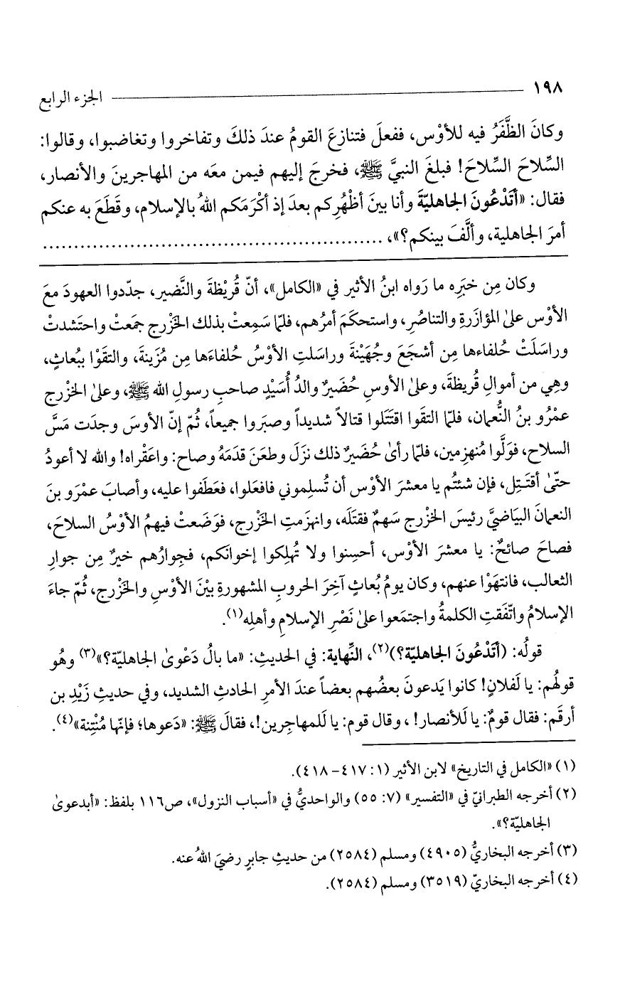 وكان الظفر فيه للأوس. ففعل فتنازع القوم عند ذلك وتفاخروا وتغاضبوا، وقالوا: السلاح السلاح! فبلغ النبي صلى اللَّه عليه وسلم، فخرج إليهم فيمن معه من المهاجرين والأنصار، فقال: أتدعون الجاهلية وأنا بين أظهركم بعد إذ أكرمكم اللَّه بالإسلام وقطع به عنكم أمر الجاهلية، وألف بينكم؟ "،