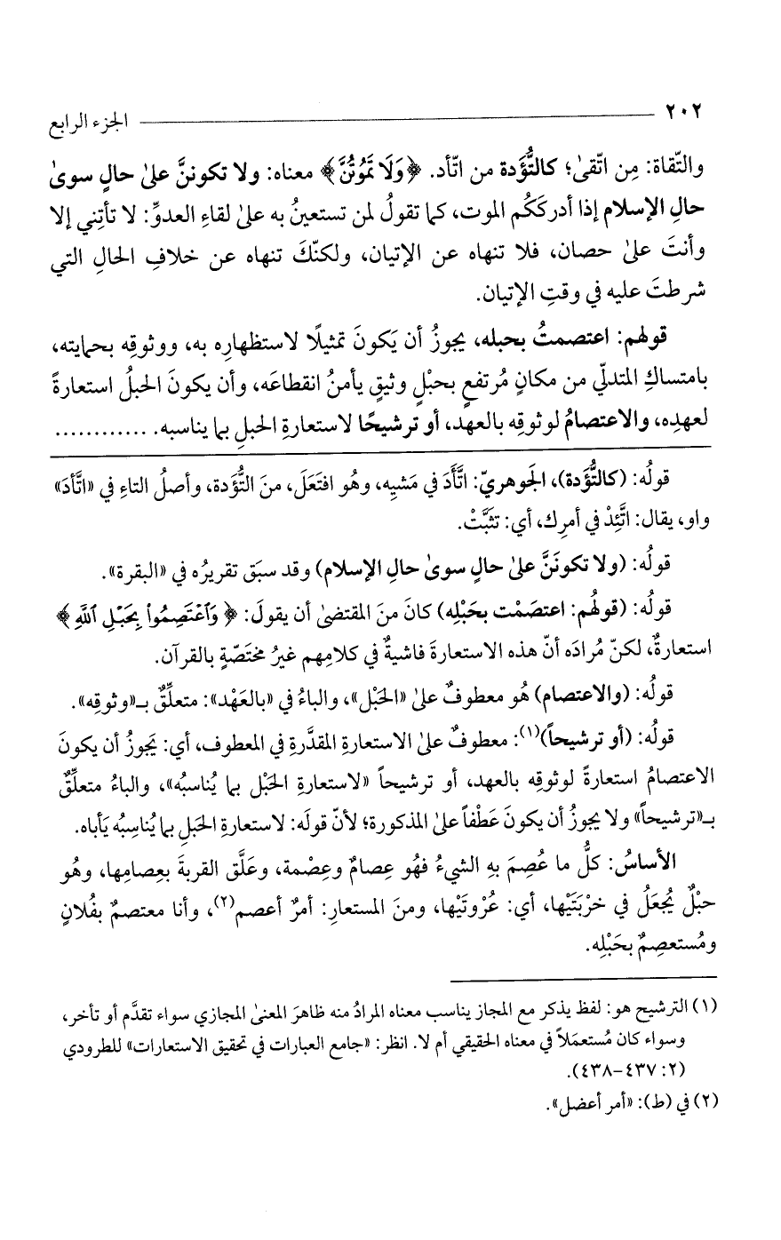 قولهم اعتصمت بحبله: يجوز أن يكون تمثيلا لاستظهاره به ووثوقه بحمايته، بامتساك المتدلي من مكان مرتفع بحبل وثيق يأمن انقطاعه، وأن يكون الحبل استعارة لعهده والاعتصام لوثوقه بالعهد، أو ترشيحا لاستعارة الحبل بما يناسبه