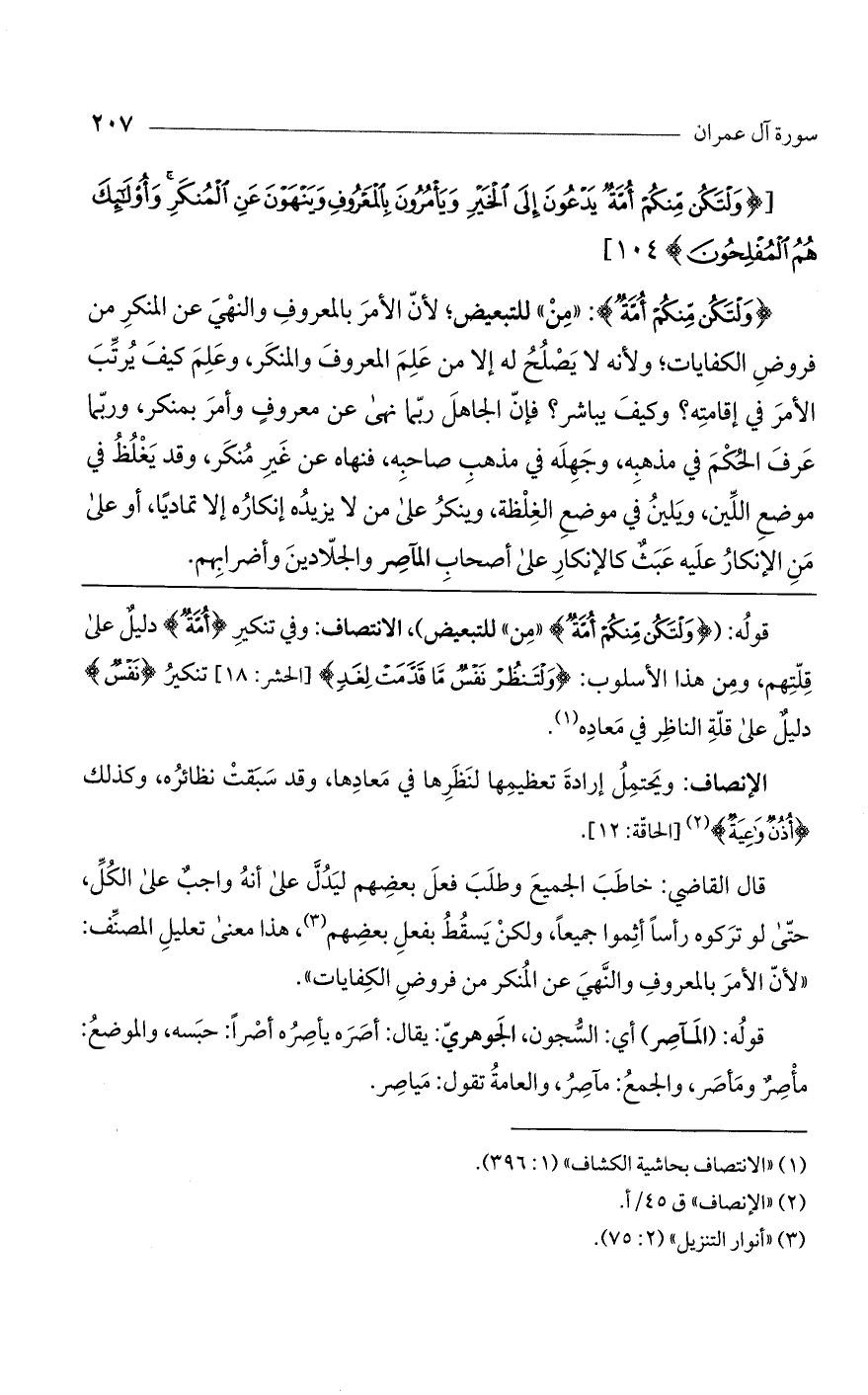 (وَلْتَكُنْ مِنْكُمْ أُمَّةٌ): "من" للتبعيض؛ لأن الأمر بالمعروف والنهى عن المنكر من فروض الكفايات؛ ولأنه لا يصلح له إلا من علم المعروف والمنكر، وعلم كيف يرتب الأمر في إقامته؟ وكيف يباشر؟ فإن الجاهل ربما نهى عن معروف وأمر بمنكر، وربما عرف الحكم في مذهبه وجهله في مذهب صاحبه فنهاه عن غير منكر، وقد يغلظ في موضع اللين، ويلين في موضع الغلظة، وينكر على من لا يزيده إنكاره إلا تماديا، أو على مَن الإنكار عليه عبث، كالإنكار على أصحاب المآصر والجلادين وأضرابهم