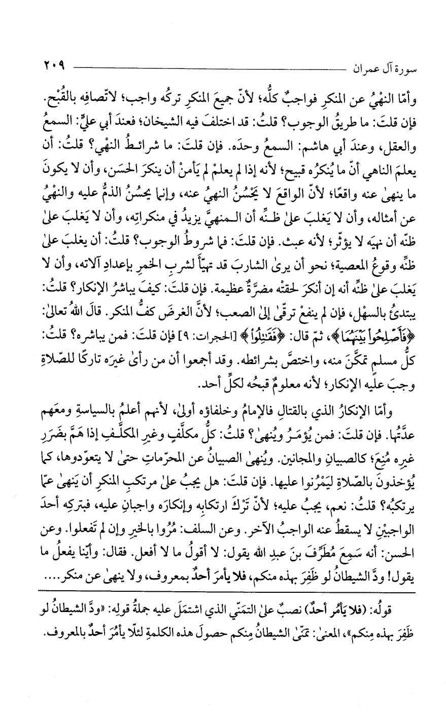 وأما النهي عن المنكر فواجب كله؛ لأنّ جميع المنكر تركه واجب؛ لاتصافه بالقبح. فإن قلت: ما طريق الوجوب؟ قلت: قد اختلف فيه الشيخان؛ فعند أبى علي: السمع والعقل، وعند أبى هاشم: السمع وحده. فإن قلت: ما شرائط النهي؟ قلت: أن يعلم الناهي أن ما ينكره قبيح؛ لأنه إذا لم يعلم لم يأمن أن ينكر الحسن، وأن لا يكون ما ينهى عنه واقعا، لأن الواقع لا يحسن النهي عنه، وإنما يحسن الذم عليه والنهى عن أمثاله، وأن لا يغلب على ظنه أن المنهي يزيد في منكراته، وأن لا يغلب على ظنه أن نهيه لا يؤثر؛ لأنه عبث.