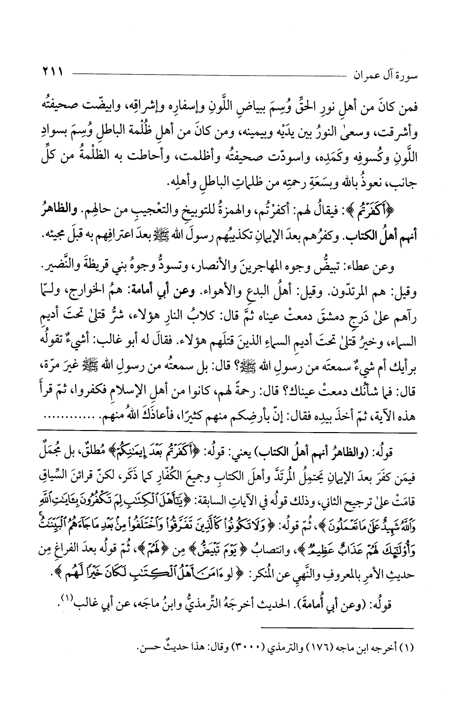 قوله: (والظاهر أنهم أهل الكتاب) يعني: قوله: (أَكَفَرْتُمْ بَعْدَ إِيمَانِكُمْ) مطلق، بل مجمل فيمن كفر بعد الإيمان يحتمل المرتد وأهل الكتاب وجميع الكفار كما ذكر، لكن قرائن السياق قامت على ترجيح الثاني، وذلك قوله في الآيات السابقة: (يَا أَهْلَ الْكِتَابِ لِمَ تَكْفُرُونَ بِآيَاتِ اللَّهِ وَاللَّهُ شَهِيدٌ عَلَى مَا تَعْمَلُونَ)، ثم قوله: (وَلا تَكُونُوا كَالَّذِينَ تَفَرَّقُوا وَاخْتَلَفُوا مِنْ بَعْدِ مَا جَاءَهُمْ الْبَيِّنَاتُ وَأُوْلَئِكَ لَهُمْ عَذَابٌ عَظِيمٌ)، وانتصاب (يَوْمَ تَبْيَضُّ) من (لَهُمْ)، ثم قوله بعد الفراغ من حديث الأمر بالمعروف والنهي عن المنكر: (لَوْ آمَنَ أَهْلُ الْكِتَابِ لَكَانَ خَيْراً لَهُمْ).