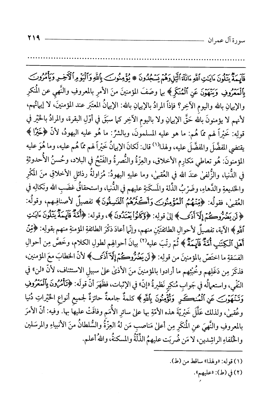 قَائِمَةٌ يَتْلُونَ آيَاتِ اللَّهِ آنَاءَ اللَّيْلِ وَهُمْ يَسْجُدُونَ* يُؤْمِنُونَ بِاللَّهِ وَالْيَوْمِ الآخِرِ وَيَامُرُونَ بِالْمَعْرُوفِ وَيَنْهَوْنَ عَنْ الْمُنْكَرِ) بما وصف المؤمنين من الأمر بالمعروف والنهي عن المنكر والإيمان بالله واليوم الآخر؟ فإذا المراد بالإيمان بالله: الإيمان المعتبر عند المؤمنين، لا إيمانهم، لأنهم لا يؤمنون بالله حق الإيمان ولا باليوم الآخر كما سبق في أول البقرة، والمراد بالخير في قوله: خيراً لهم مما هم: ما هو عليه المسلمون، وبالشر: ما هو عليه اليهود، لأن (خَيْراً) يقتضي المفضل والمفضل عليه، ولهذا قال: لكان الإيمان خيراً لهم مما هم عليه، وما هو عليه المؤمنون: هو تعاطي مكارم الأخلاق، والعزة والنصرة والفتح في البلاد، وحسن الأحدوثة في الدنيا، والزلفى عند الله في العقبى، وما عليه اليهود: مزاولة رذائل الأخلاق من المكر والخديعة والدهاء، وضرب الذلة والمسكنة عليهم في الدنيا، واستحقاق غضب الله ونكاله في العقبى، فقوله: (مِنْهُمْ الْمُؤْمِنُونَ وَأَكْثَرُهُمْ الْفَاسِقُونَ) تفصيل لأصنافهم، وقوله: (لَنْ يَضُرُّوكُمْ إِلاَّ أَذًى) إلى قوله: (وَكَانُوا يَعْتَدُونَ)، وقوله: (أُمَّةٌ قَائِمَةٌ يَتْلُونَ آيَاتِ اللَّهِ) الآية، تفصيل لأحوال الطائفتين منهم، وإنما أعاد ذكر الطائفة المؤمنة منهم بقوله: (مِنْ أَهْلِ الْكِتَابِ أُمَّةٌ قَائِمَةٌ) ثم رتب عليه بيان أحوالهم لطول الكلام، وخص من أحوال الفسقة ما اختص بالمؤمنين من قوله: (لَنْ يَضُرُّوكُمْ إِلاَّ أَذًى) لأن الخطاب مع المؤمنين، فذكر من دغلهم وخبثهم ما أرادوا بالمؤمنين من الأذى على سبيل الاستئناف، لأن "لن" في النفي، واستعماله في جواب منكر نظيرة "إن" في الإثبات، فظهر أن قوله: (تَامُرُونَ بِالْمَعْرُوفِ وَتَنْهَوْنَ عَنْ الْمُنكَرِ وَتُؤْمِنُونَ بِاللَّهِ) كلمة جامعة حائزة لجميع أنواع الخيرات دنيا وعقبى، ولذلك علل خيرية هذه الأمة بها على سائر الأمم وفاقت عليها بها. وفيه: أن الأمر بالمعروف والنهي عن المنكر من أعلى مناصب من له العزة والسلطان من الأنبياء والمرسلين والخلفاء الراشدين، لا من ضربت عليهم الذلة والمسكنة، والله أعلم.
