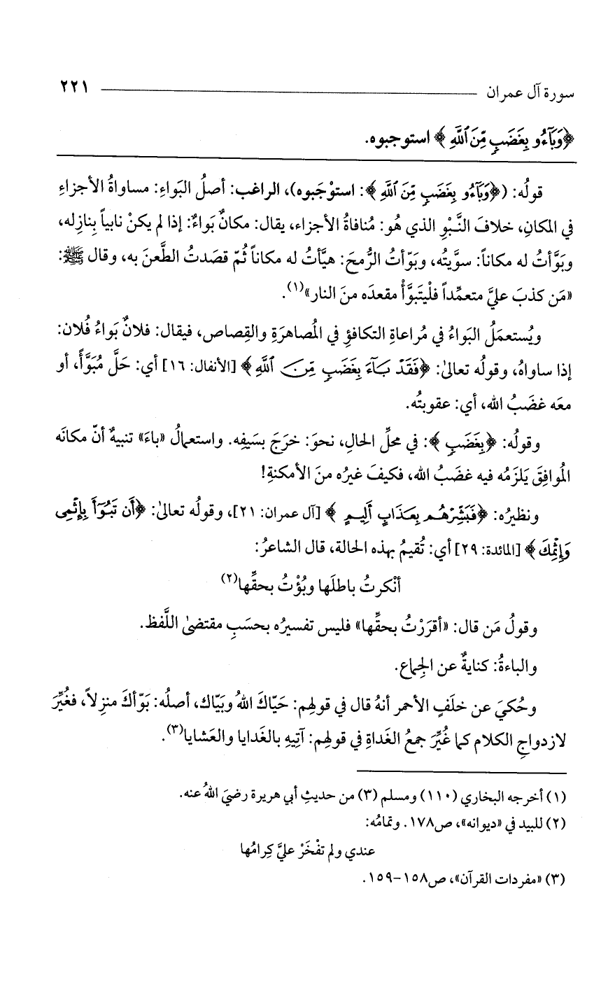 قوله: ((وَبَاءُوا بِغَضَبٍ مِنْ اللَّهِ): استوجبوه)، الراغب: أصل البواء: مساواة الأجزاء في المكان، خلاف النبو الذي هو: منافاة الأجزاء، يقال: مكان بواء: إذا لم يكن نابياً بنازله، وبوأت له مكاناً: سويته، وبوأت الرمح: هيأت له مكاناً ثم قصدت الطعن به، وقال صلى الله عليه وسلم: "من كذب علي متعمداً فليتبوأ مقعده من النار".