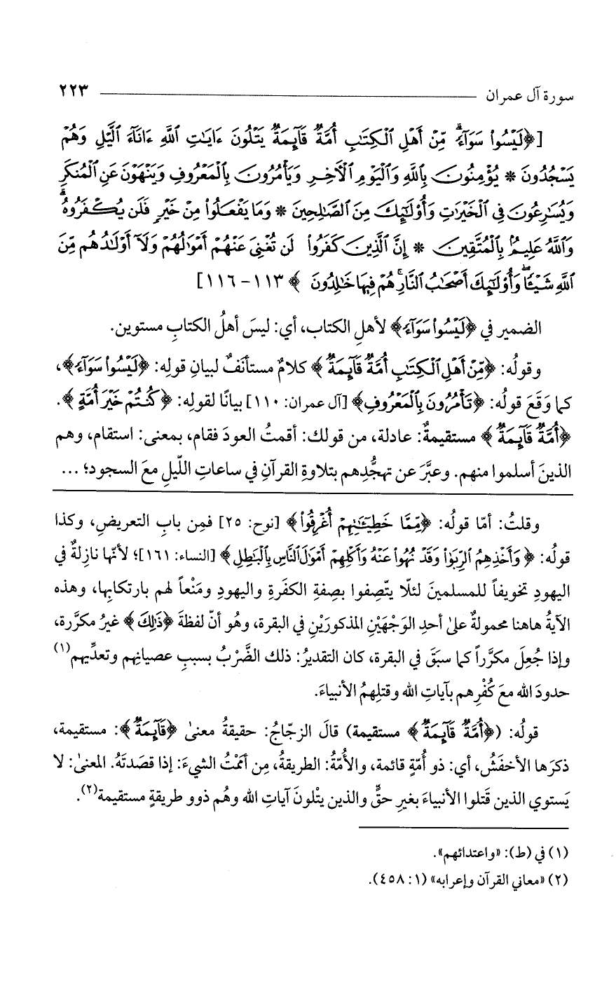 قوله: (أُمَّةٌ قَائِمَةٌ) مستقيمة) قال الزجاج: حقيقة معنى (قَائِمَةٌ): مستقيمة، ذكرها الأخفش، أي: ذو أمة قائمة، والأمة: الطريقة، من أممت الشيء: إذا قصدته. المعنى: لا يستوي الذين قتلوا الأنبياء بغير حق والذين يتلون آيات اللهم وهم ذوو طريقة مستقيمة.