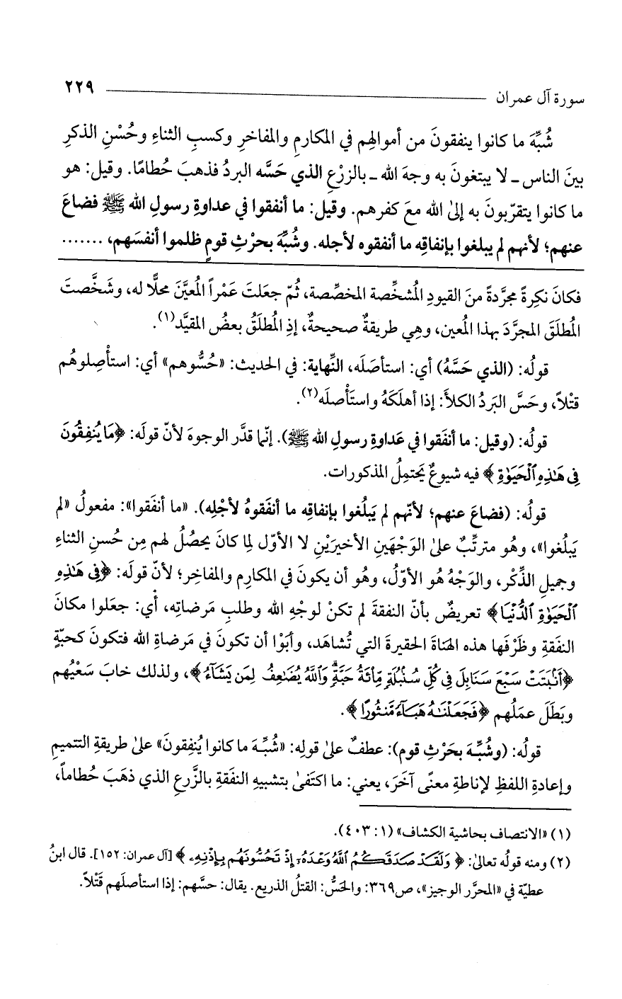 قوله: (فضاع عنهم؛ لأنهم لم يبلغوا بإنفاقه ما أنفقوه لأجله). "ما أنفقوا": مفعول "لم يبلغوا"، وهو مترتب على الوجهين الأخيرين لا الأول لما كان يحصل لهم من حسن الثناء وجميل الذكر، والوجه هو الأول، وهو أن يكون في المكارم والمفاخر؛ لأن قوله: (فِي هَذِهِ الْحَيَاةِ الدُّنْيَا) تعريض بأن النفقة لم تكن لوجه الله وطلب مرضاته، أي: جعلوا مكان النفقة وظرفها هذه الهناة الحقيرة التي تشاهد، وأبوا أن تكون في مرضاة الله فتكون كحبة (أَنْبَتَتْ سَبْعَ سَنَابِلَ فِي كُلِّ سُنْبُلَةٍ مِائَةُ حَبَّةٍ وَاللَّهُ يُضَاعِفُ لِمَنْ يَشَاءُ)، ولذلك خاب سعيهم وبطل عملهم (فَجَعَلْنَاهُ هَبَاءً مَنْثُوراً).