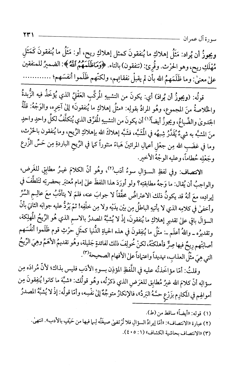 الانتصاف: وفي لفظ السؤال سوء أدب، وهو أن الكلام غير مطابق للغرض، والواجب أن يقال: ما وجه مطابقته؟ ولو أورد هذا اللفظ على إمام معتبر بحضرته لتلطف في إيراده، مع أنه قد يكون ذلك الاعتراض محققاً لا جواب عنه، فلم لا يتأدب مع عالم السر وأخفى في كلامه الذي لا يأتيه الباطل من بين يديه ولا من خلفه! ثم يرد عليه جوابه الثاني بأن السؤال باق على تقدير إهلاك ما ينفقون، إذ لا يشبه المصدر بالاسم الذي هو الربح المهلكة، وتقديرهـ والله أعلمـ: مثل ما ينفقون في هذه الحياة الدنيا كمثل حرث قوم ظلموا أنفسهم أصابتهم ريح فيها صر فأهلكته، لكن خولف ذلك لفائدة جليلة، وهو تقديم الأهم وهي الريح التي هي مثل العذاب، تهديداً واعتماداً على الأفهام الصحيحة.
