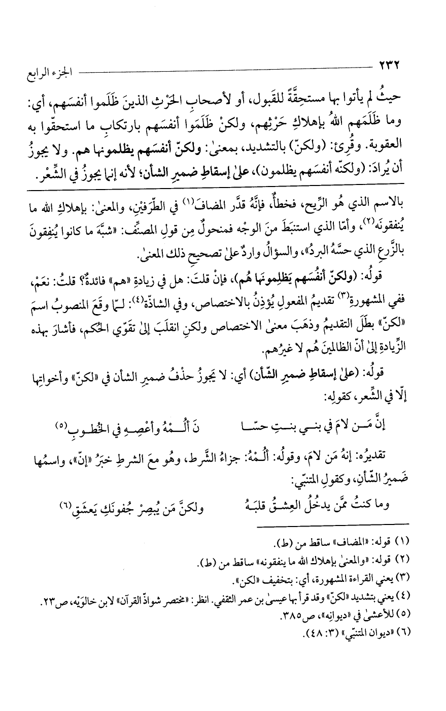 قوله: (ولكن أنفسهم يظلمونها هم)، فإن قلت: هل في زيادة "هم" فائدة؟ قلت: نعم، ففي المشهورة تقديم المفعول يؤذن بالاختصاص، وفي الشاذة: لما وقع المنصوب اسم "لكن" بطل التقديم وذهب معنى الاختصاص ولكن انقلب إلى تقوي الحكم، فأشار بهذه الزيادة إلى أن الظالمين هم لا غيرهم.