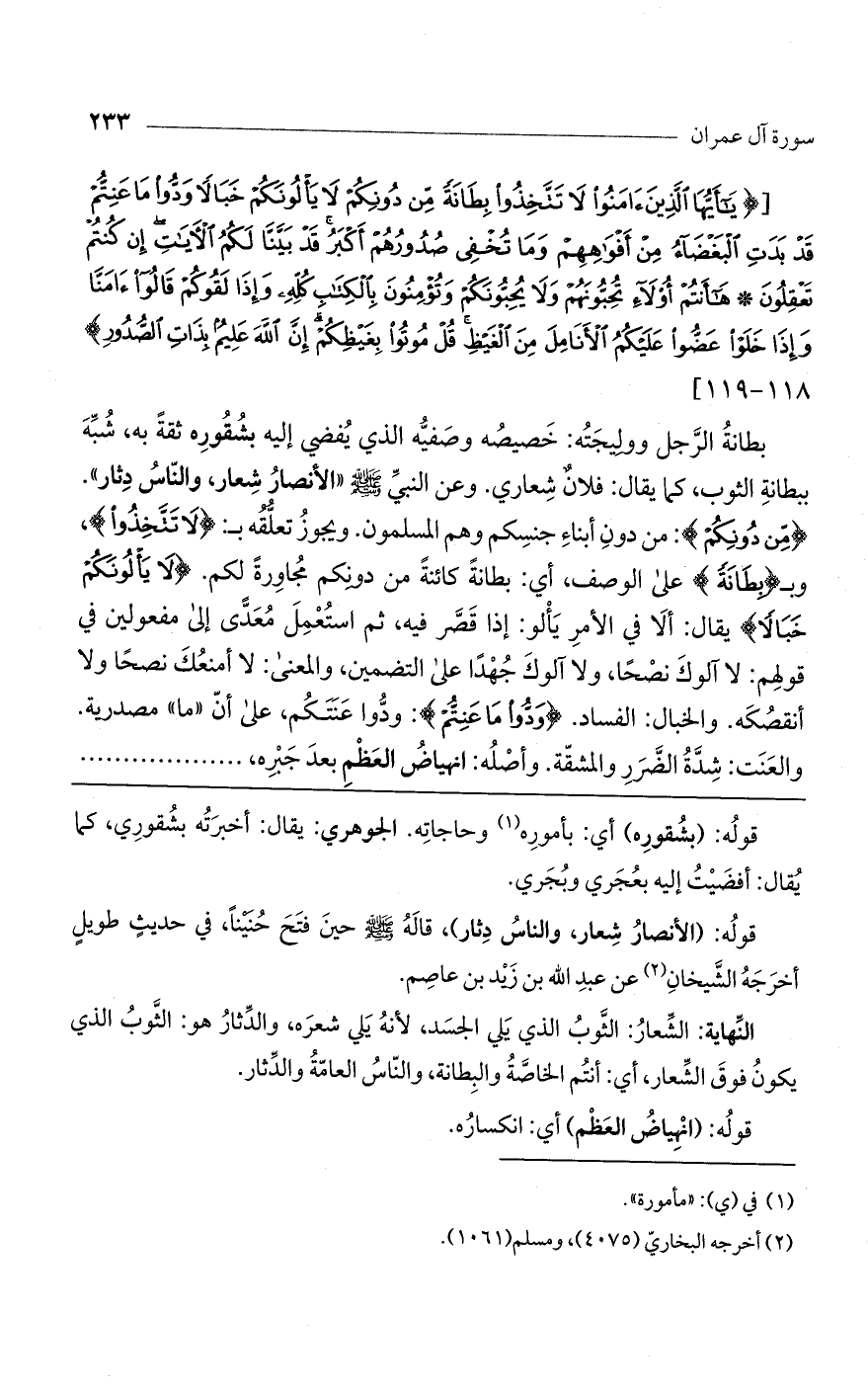(يا أَيُّهَا الَّذِينَ آمَنُوا لا تَتَّخِذُوا بِطانَةً مِنْ دُونِكُمْ لا يَالُونَكُمْ خَبالاً وَدُّوا ما عَنِتُّمْ قَدْ بَدَتِ الْبَغْضاءُ مِنْ أَفْواهِهِمْ وَما تُخْفِي صُدُورُهُمْ أَكْبَرُ قَدْ بَيَّنَّا لَكُمُ الْآياتِ إِنْ كُنْتُمْ تَعْقِلُونَ (118) ها أَنْتُمْ أُولاءِ تُحِبُّونَهُمْ وَلا يُحِبُّونَكُمْ وَتُؤْمِنُونَ بِالْكِتابِ كُلِّهِ وَإِذا لَقُوكُمْ قالُوا آمَنَّا وَإِذا خَلَوْا عَضُّوا عَلَيْكُمُ الْأَنامِلَ مِنَ الْغَيْظِ قُلْ مُوتُوا بِغَيْظِكُمْ إِنَّ اللَّهَ عَلِيمٌ بِذاتِ الصُّدُورِ) 118 ـ 119]