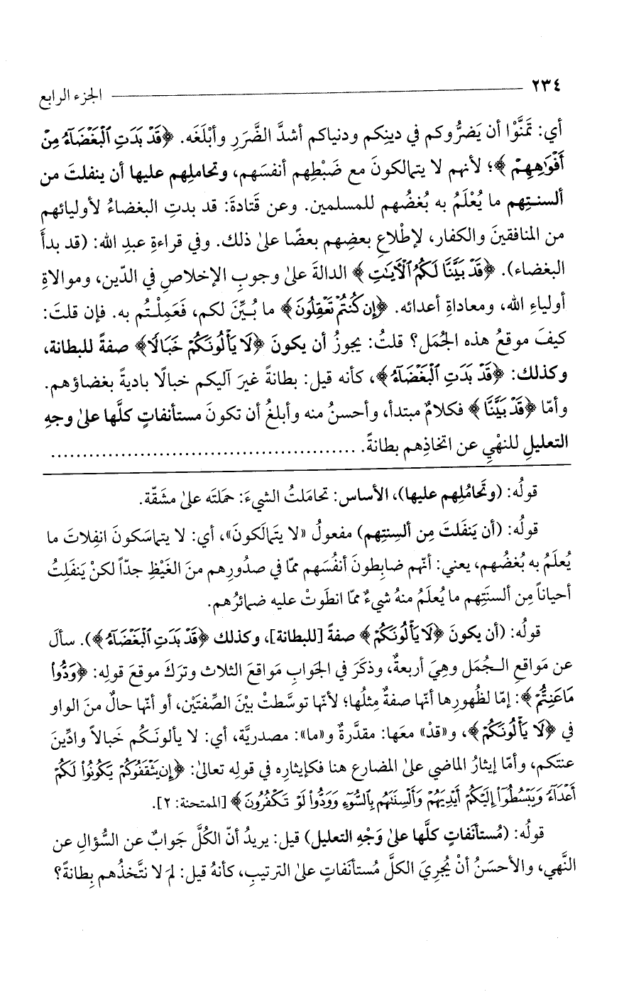وفي قراءة عبد اللَّه (قد بدأ البغضاء). (قَدْ بَيَّنَّا لَكُمُ الْآياتِ) الدالة على وجوب الإخلاص في الدين، وموالاة أولياء اللَّه ومعاداة أعدائه (إِنْ كُنْتُمْ تَعْقِلُونَ) ما بين لكم، فعملتم به. فإن قلت: كيف موقع هذه الجمل؟ قلت يجوز أن يكون (لا يَالُونَكُمْ خَبَالًا) صفة للبطانة، وكذلك (قَدْ بَدَتِ الْبَغْضاءُ) كأنه قيل: بطانة غير آليكم خبالا بادية بغضاؤهم. وأما (قَدْ بَيَّنَّا) فكلام مبتدأ، وأحسن منه وأبلغ أن تكون مستأنفات كلها على وجه التعليل للنهى عن اتخاذهم بطانة