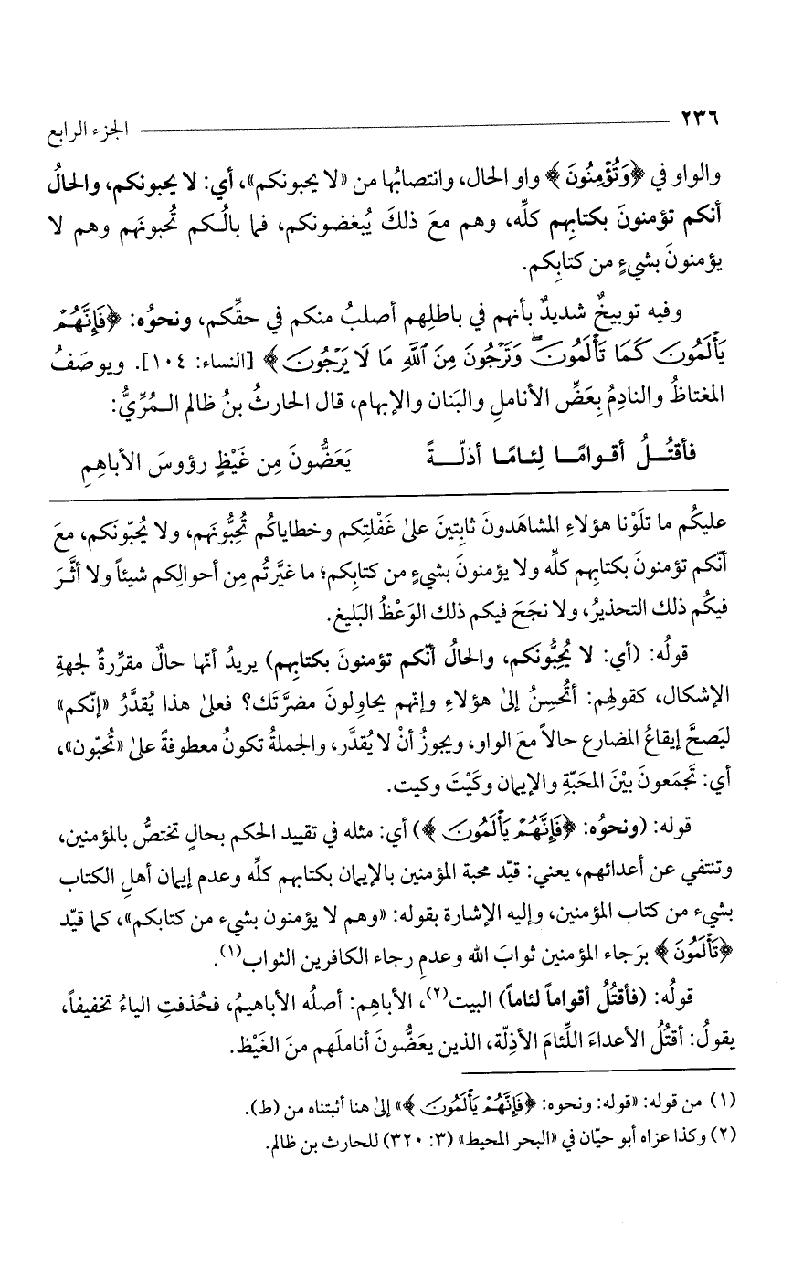 والواو في (وَتُؤْمِنُونَ) واو للحال، وانتصابها من "لا يحبونكم"، أي: لا يحبونكم، والحال أنكم تؤمنون بكتابهم كله، وهم مع ذلك يبغضونكم. فما بالكم تحبونهم وهم لا يؤمنون بشيء من كتابكم.