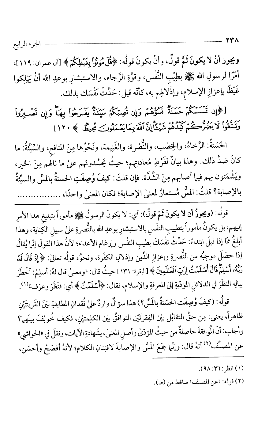 (إِنْ تَمْسَسْكُمْ حَسَنَةٌ تَسُؤْهُمْ وَإِنْ تُصِبْكُمْ سَيِّئَةٌ يَفْرَحُوا بِها وَإِنْ تَصْبِرُوا وَتَتَّقُوا لا يَضُرُّكُمْ كَيْدُهُمْ شَيْئاً إِنَّ اللَّهَ بِما يَعْمَلُونَ مُحِيطٌ) 120]