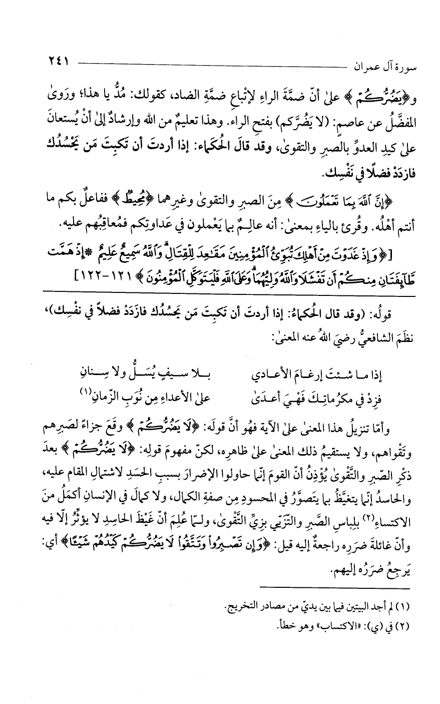 وأما تنزيل هذا المعنى على الآية فهو أن قوله: (لا يَضُرُّكُمْ) وقع جزاء لصبرهم وتقواهم، ولا يستقيم ذلك المعنى على ظاهره، لكن مفهوم قوله: (لا يَضُرُّكُمْ) بعد ذكر الصبر والتقوى يؤذن أن القوم إنما حاولوا الإضرار بسبب الحسد لاشتمال المقام عليه، والحاسد إنما يتغيظ بما يتصور في المحسود من صفة الكمال، ولا كمال في الإنسان أكمل من الاكتساء بلباس الصبر والتزيي بزي التقوى، ولما علم أن غيظ الحاسد لا يؤثر إلا فيه وأن غائلة ضرره راجعة إليه قيل: (إِنْ تَصْبِرُوا وَتَتَّقُوا لا يَضُرُّكُمْ كَيْدُهُمْ شَيْئاً) أي: يرجع ضرره إليهم.